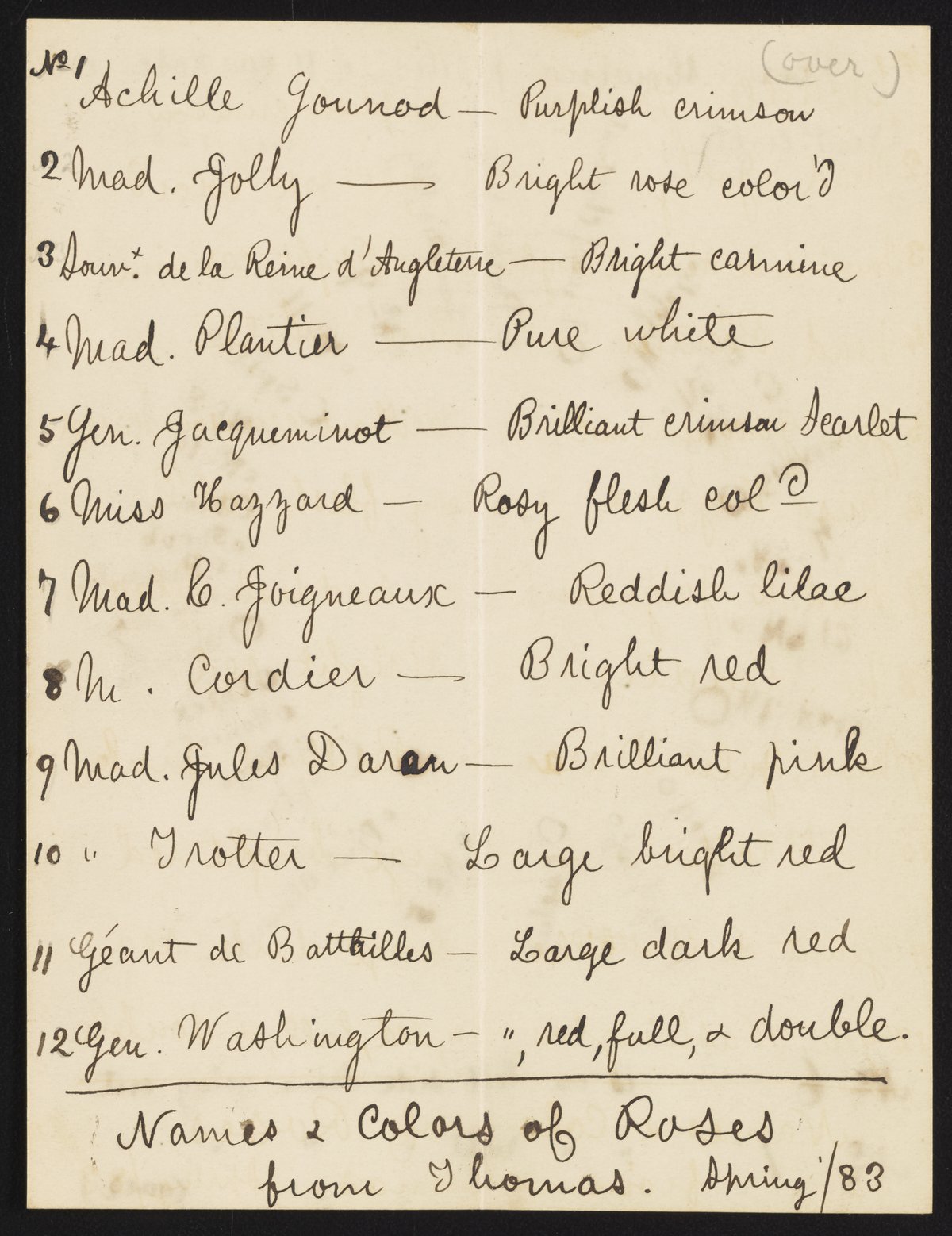 Small JPG1200 x 1560px — 232 KBLarge JPG2880 x 3745px — 960 KBFull-sized JPG2888 x 3755px — 959 KBOriginal fileTIFF — 2888 x 3755px — 31.1 MBHand-drawn map by James Curtis Booth (1810-1888) indicating the positions of ten new rose varieties provided to him by Joseph W. Thomas. Booth lists the names and colors of the new roses on the document's verso.