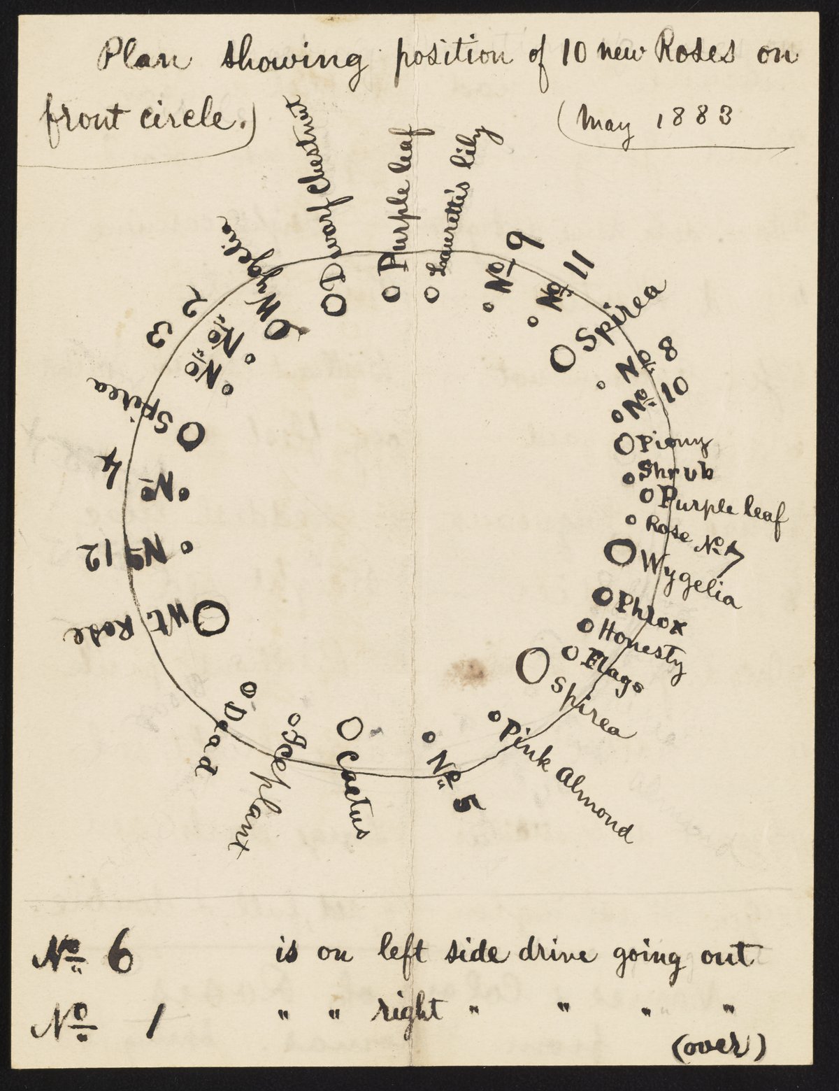 Booth, James Curtis. “Plan Showing Position of 10 New Roses on Front Circle,” May 1883. Papers of James Curtis Booth, Box 2, Folder 10. Science History Institute. Philadelphia. https://digital.sciencehistory.org/works/656gw1h.