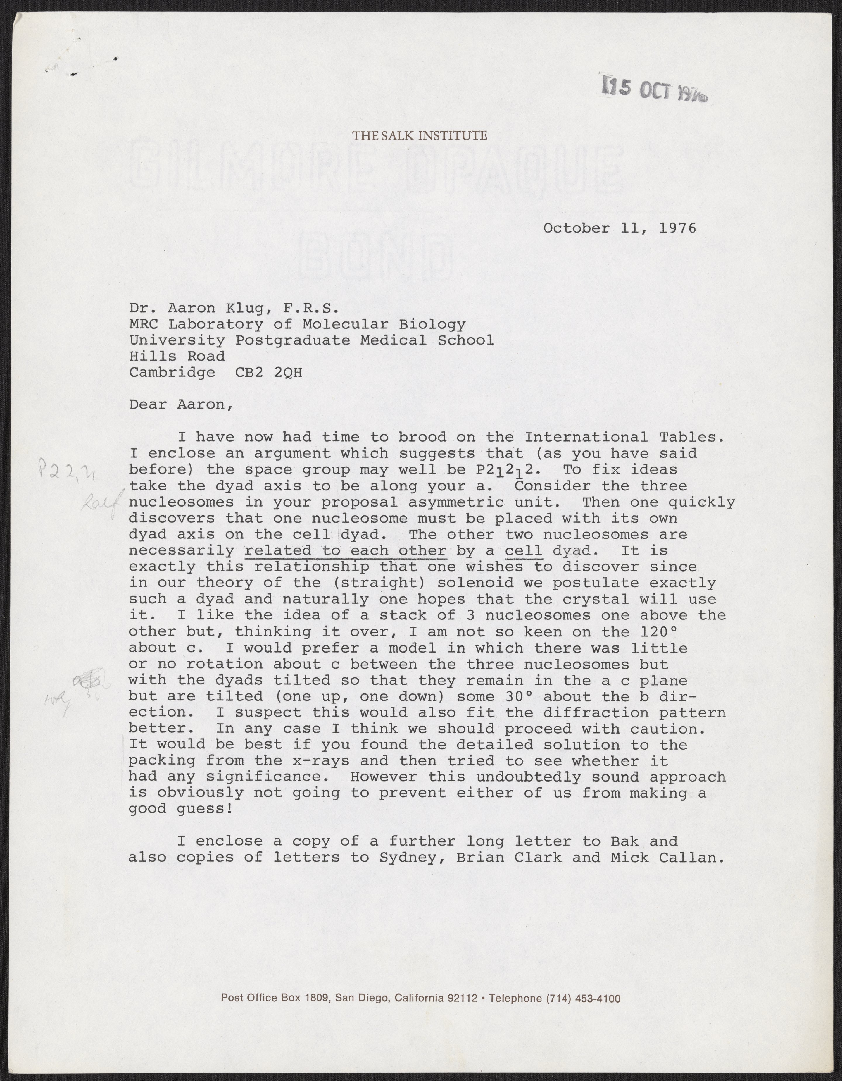 Crick, Francis. “Letter from Francis Crick to Aaron Klug, October 11, 1976,” October 11, 1976. History of Molecular Biology Collection, Box 19, Folder 25. Science History Institute. Philadelphia. https://digital.sciencehistory.org/works/67du4t0.