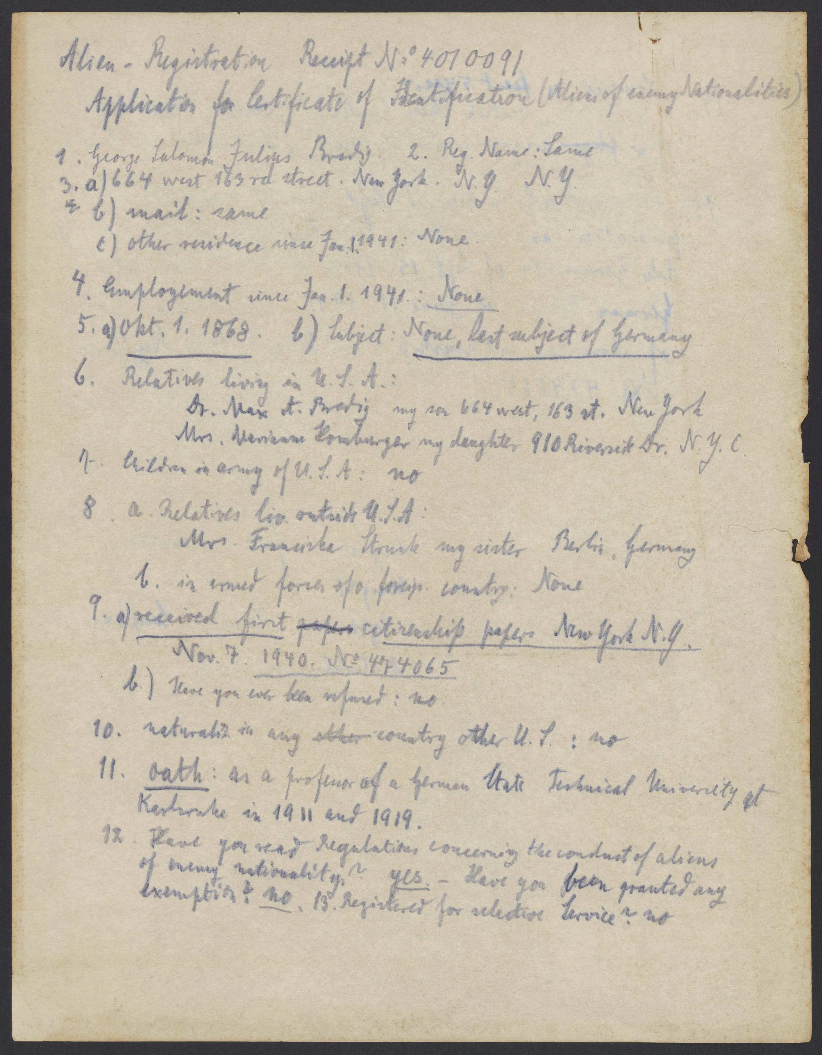 Bredig, Georg. “Application for Certificate of Identification (Aliens of Enemy Nationalities),” February 18, 1942. Papers of Georg and Max Bredig, Box 3, Folder 8. Science History Institute. Philadelphia. https://digital.sciencehistory.org/works/682lxbb.