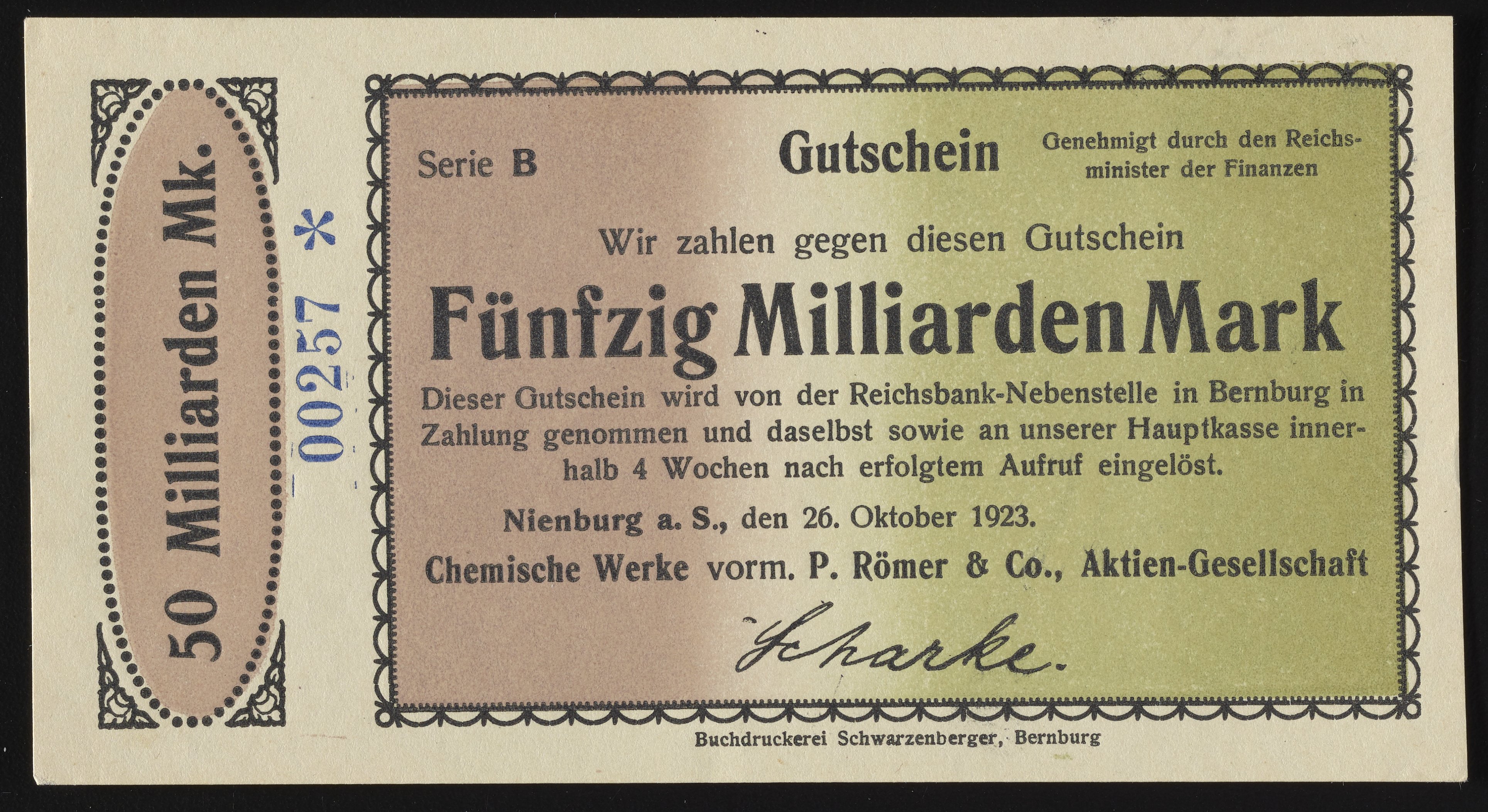 This Fünfzig Milliarden Mark Gutschein, or fifty billion Mark voucher, was issued by Chemische Werke P. Römer & Company (Chemical Works P. Römer & Company). Paper features a watermark design.