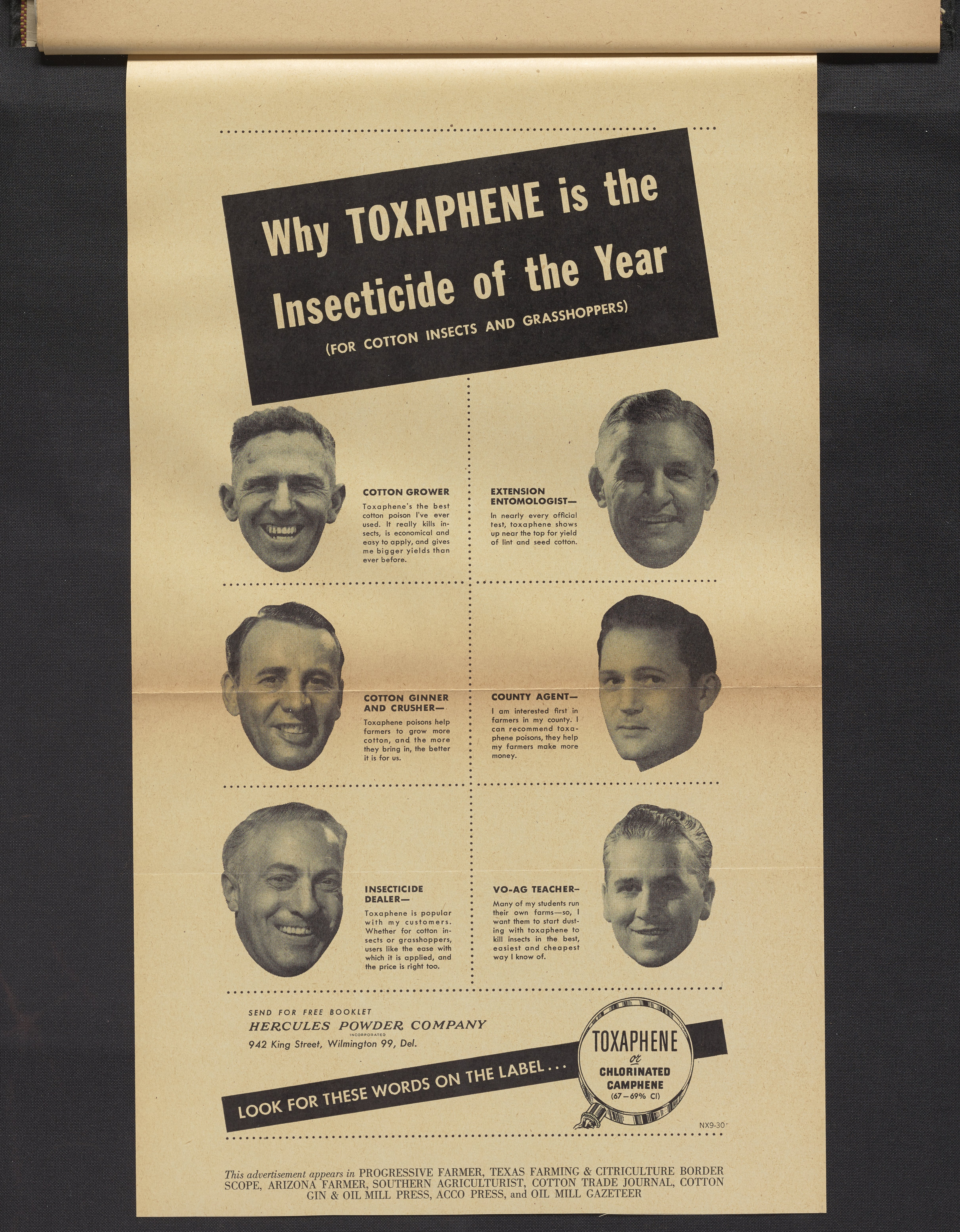 Hercules Incorporated. “Why Toxaphene Is the Insecticide of the Year (for Cotton Insects and Grasshoppers).” 1949 Hercules Advertisements, 1949. Records of Hercules Incorporated, Volume 1949. Science History Institute. Philadelphia. https://digital.sciencehistory.org/works/6d56zx48z.