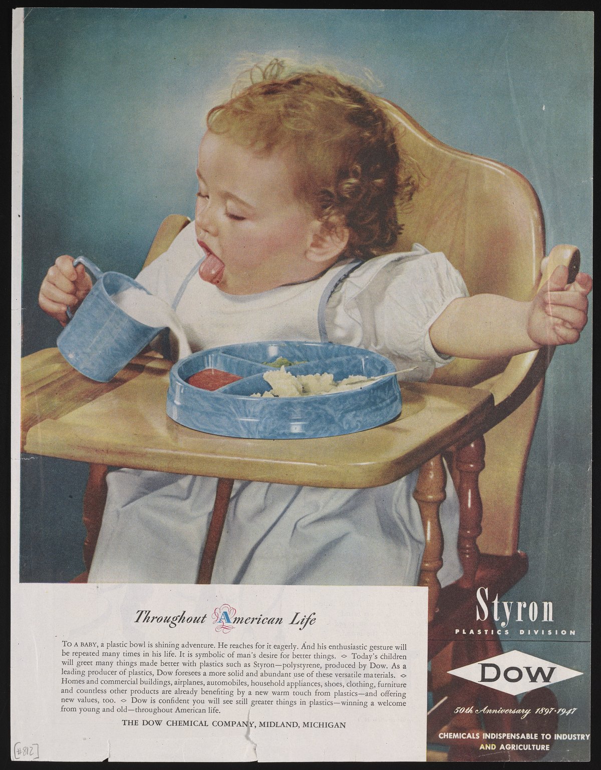 Color print advertisement for Styron, the trade name for Styrenic plastics historically manufactured and sold by the Dow Chemical Company for a variety of consumer applications. The advertisement features a photograph of a young child seated at a high chair, with a plastic cup and plate. The accompanying text promotes the use of plastic in manufacturing, and describes the many products "already benefiting by a new warm touch from plastics." This advertisement appeared on page 69 of the May 3, 1947 edition of The Saturday Evening Post.