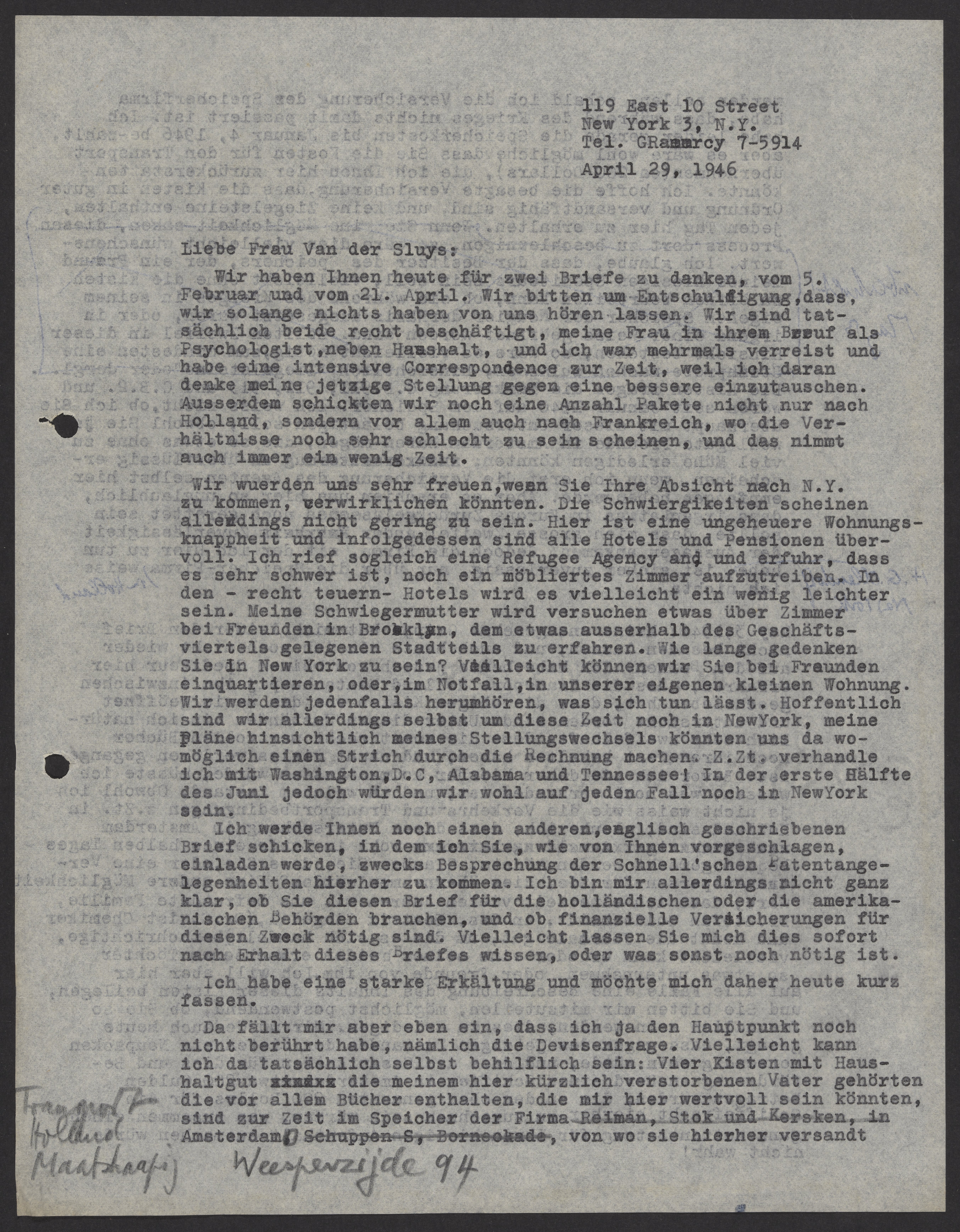 Letter from Max Bredig to Anny van der Sluys, April 29, 1946
