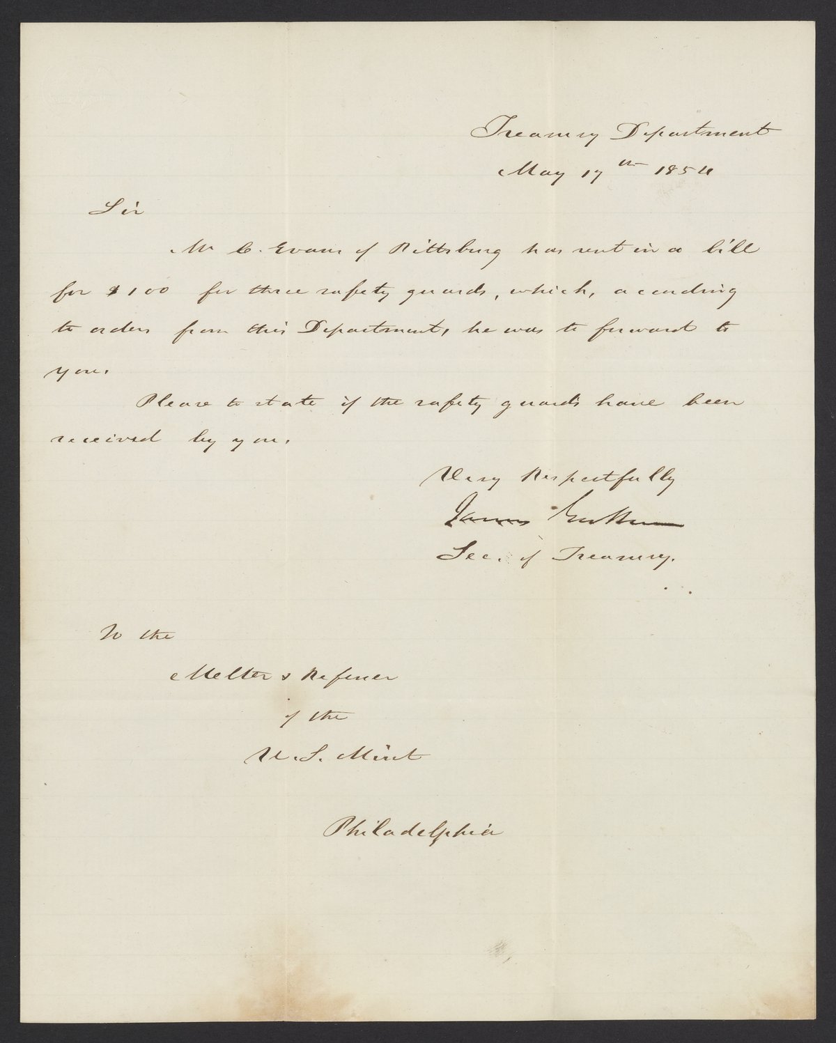 Small JPG1200 x 1497px — 145 KBLarge JPG2880 x 3593px — 807 KBFull-sized JPG3309 x 4128px — 1.0 MBOriginal fileTIFF — 3309 x 4128px — 39.1 MBJames B. Guthrie (1792 - 1869), United States Secretary of the Treasury from 1853-1857, informs James Curtis Booth (1810-1888) that the Treasury has been billed $100 for his order of three Evans Safety Guards.