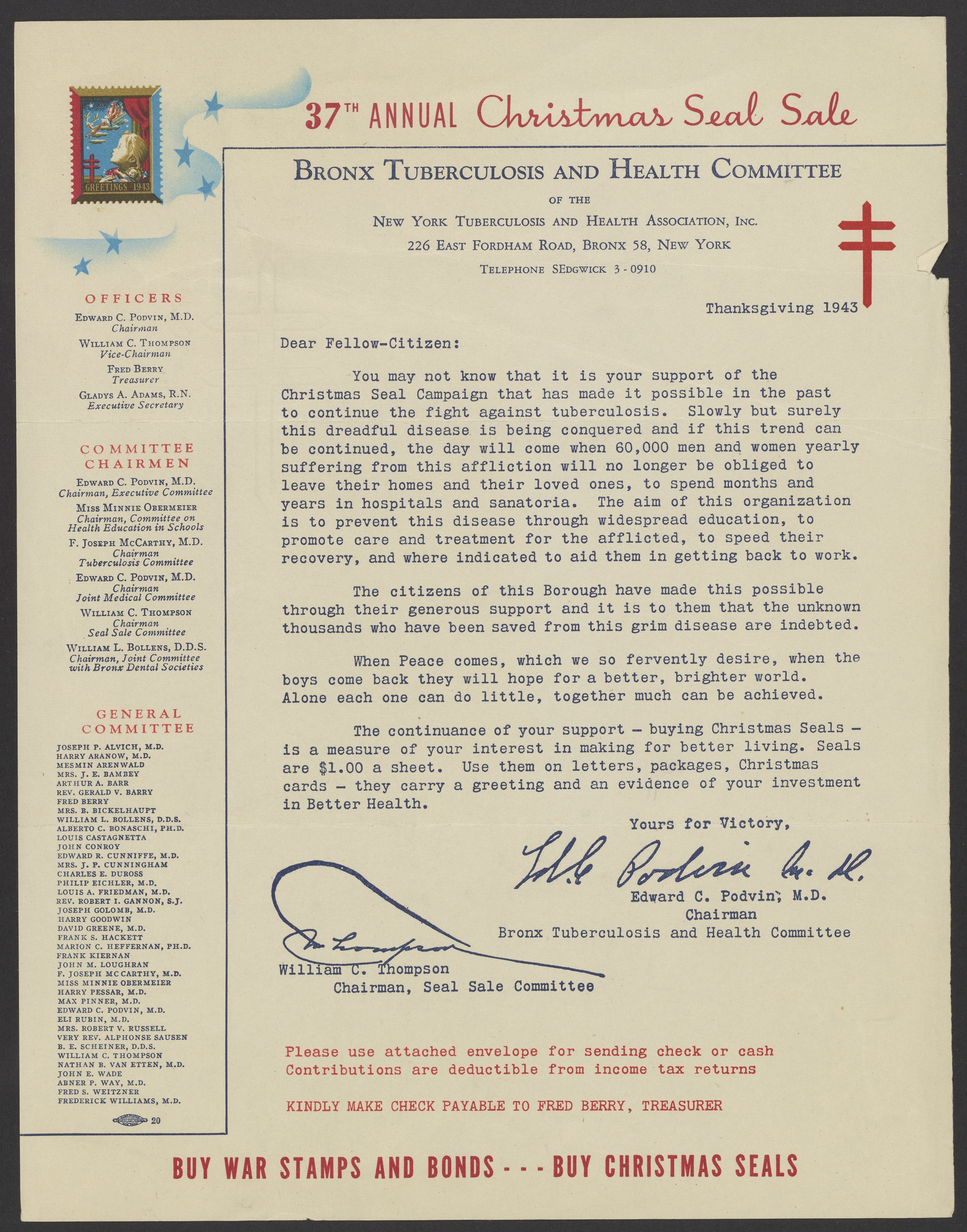 Letter from the Bronx Tuberculosis and Health Committee