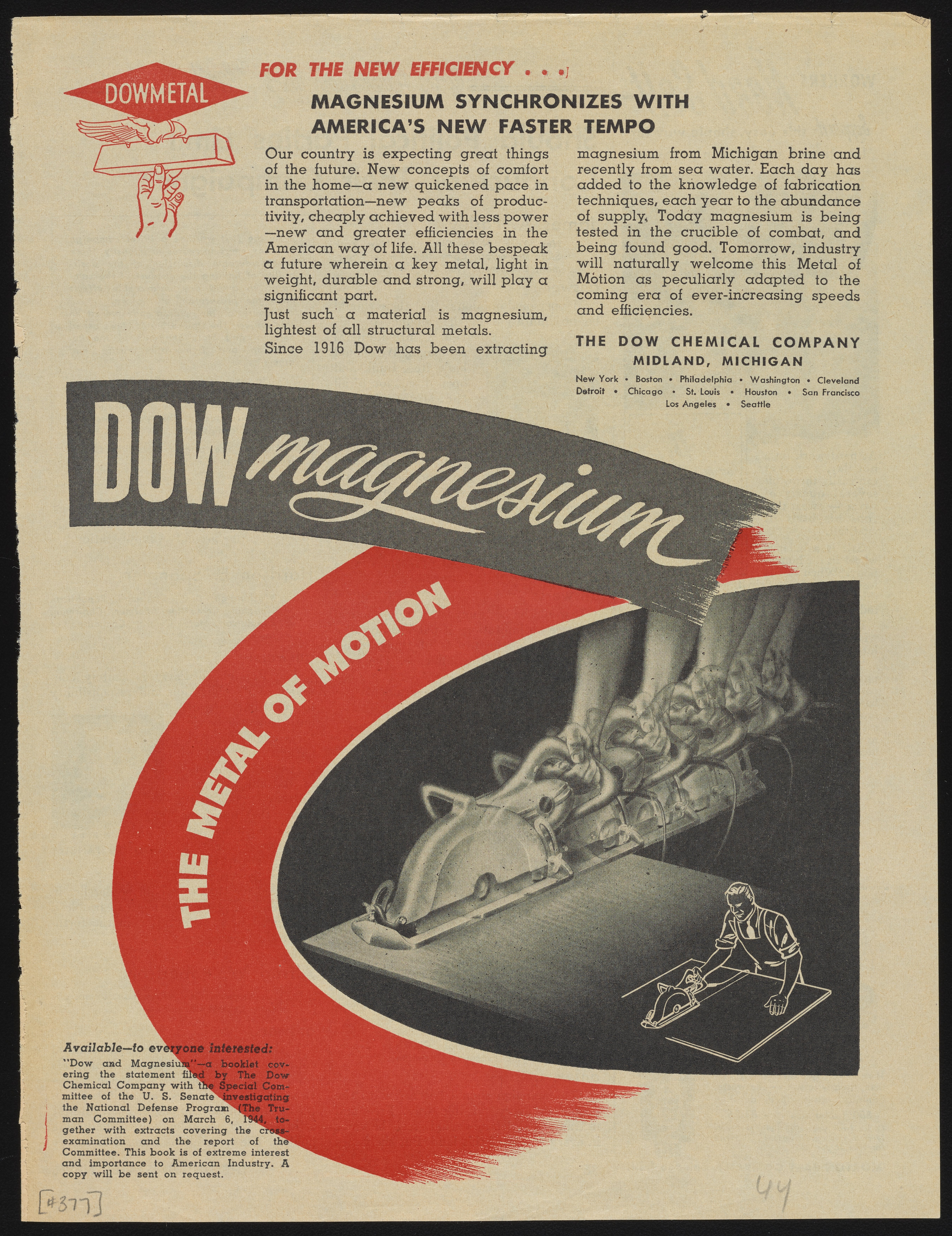 Dow Chemical Company. “Dowmetal Magnesium: The Metal of Motion,” 1944. Advertisements from the Dow Chemical Historical Collection, Box 8. Science History Institute. Philadelphia. https://digital.sciencehistory.org/works/6h1grey.