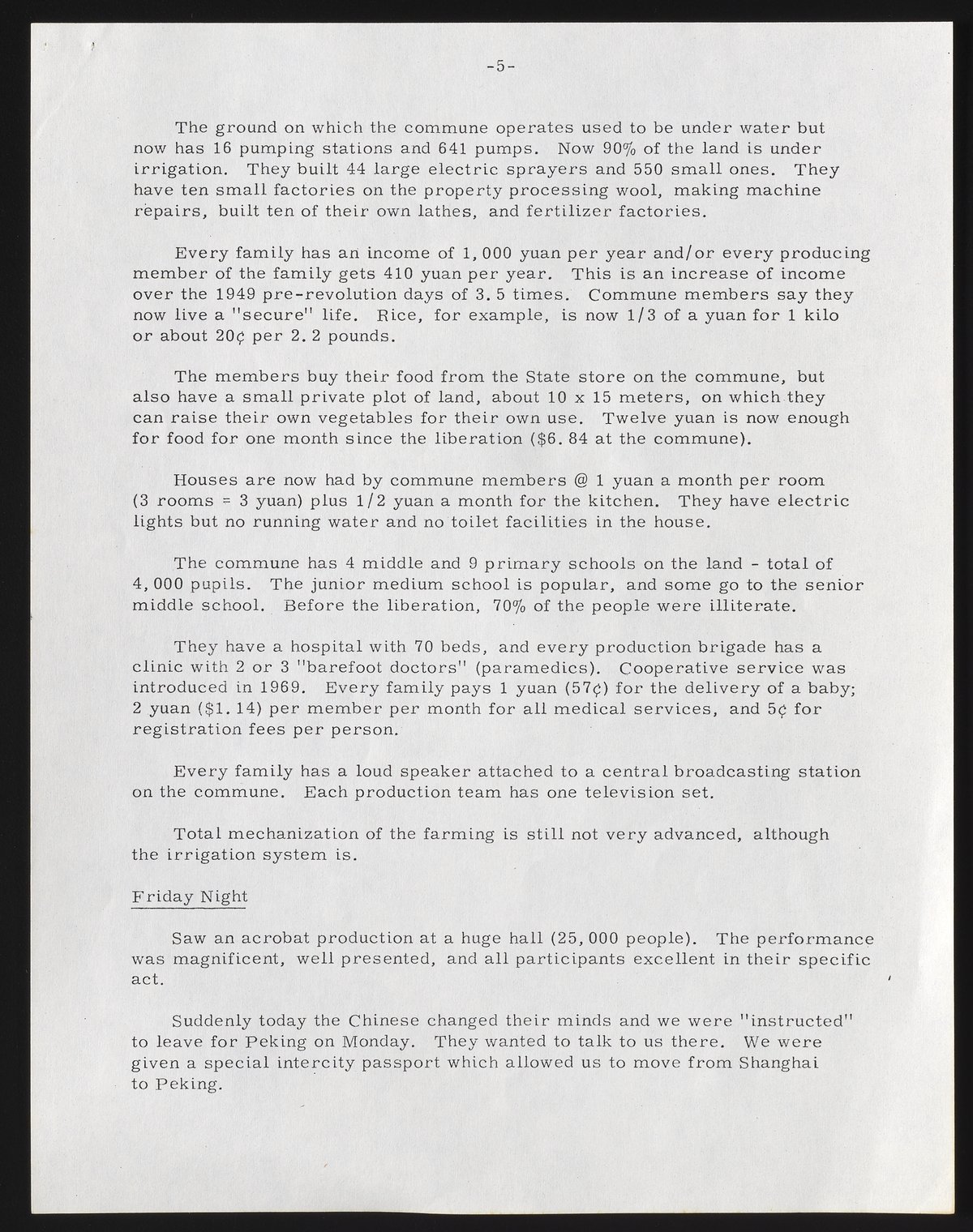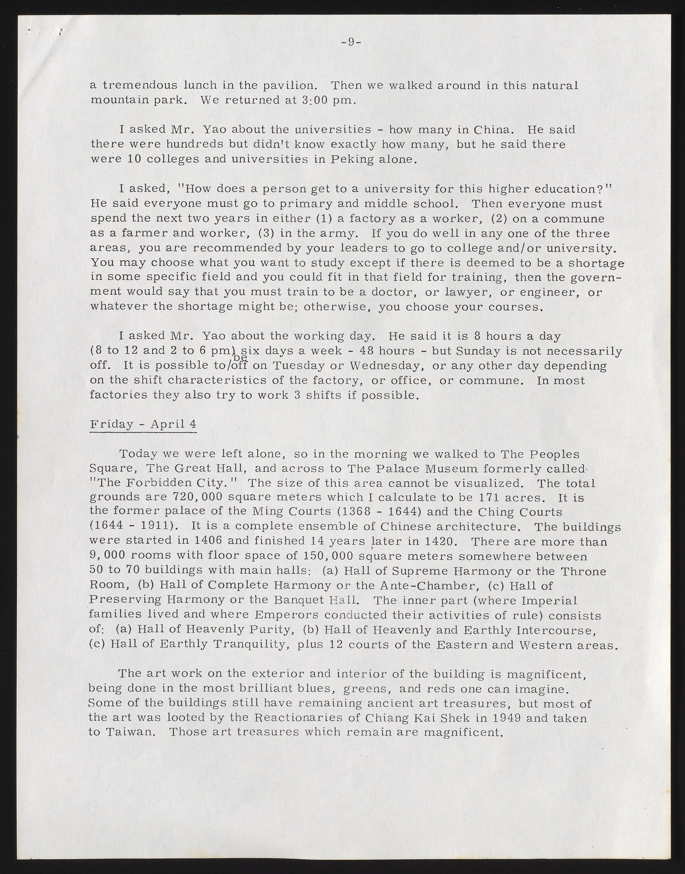Cherniss visited sites of historical interest, including the Summer Palace, the Temple of the Sleeping Buddha, Fragrant Hill, People’s Square, the Great Hall, the Palace Museum, the Imperial Gardens, Ming Tombs, and the Great Wall. Other tours focused on modern facilities. At Children’s Palace #11, he saw children pursuing afterschool education in music and art. At #1 Pulmonary Tuberculosis Hospital, Cherniss observed surgery, with acupuncture as anesthesia. He was generally unimpressed by the conditions, cleanliness, and equipment at the hospital. He also visited the Long March People’s Commune, providing details about its history and output.