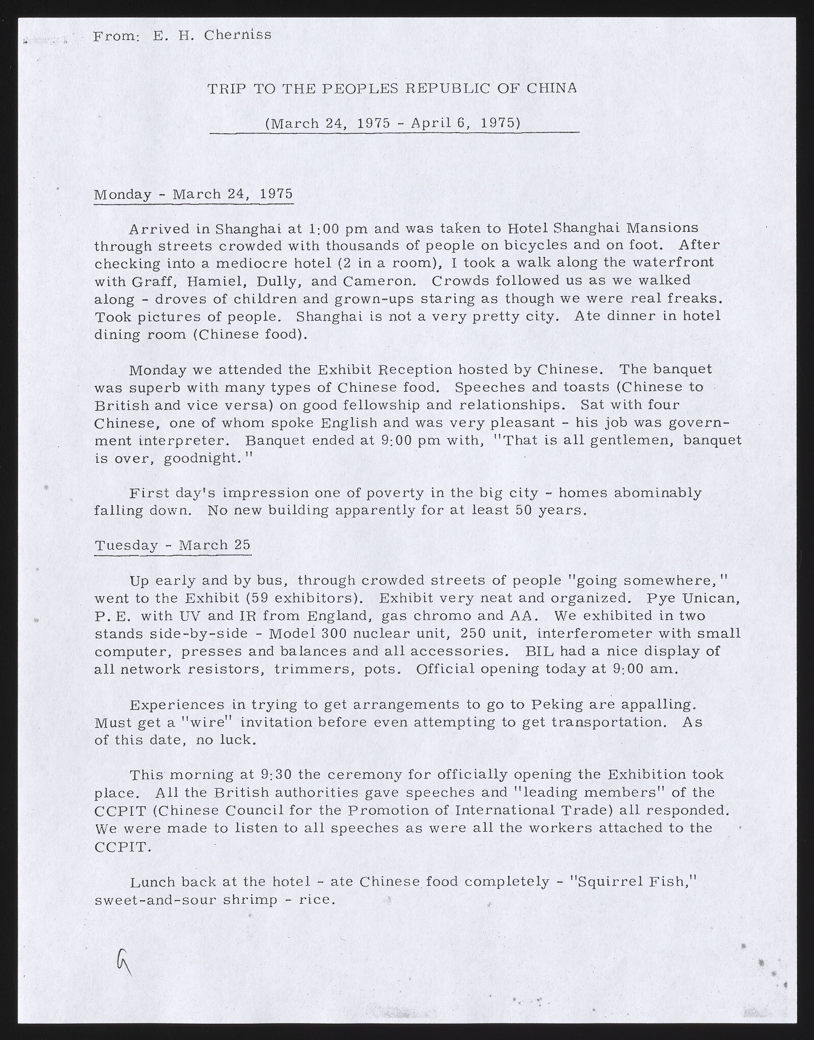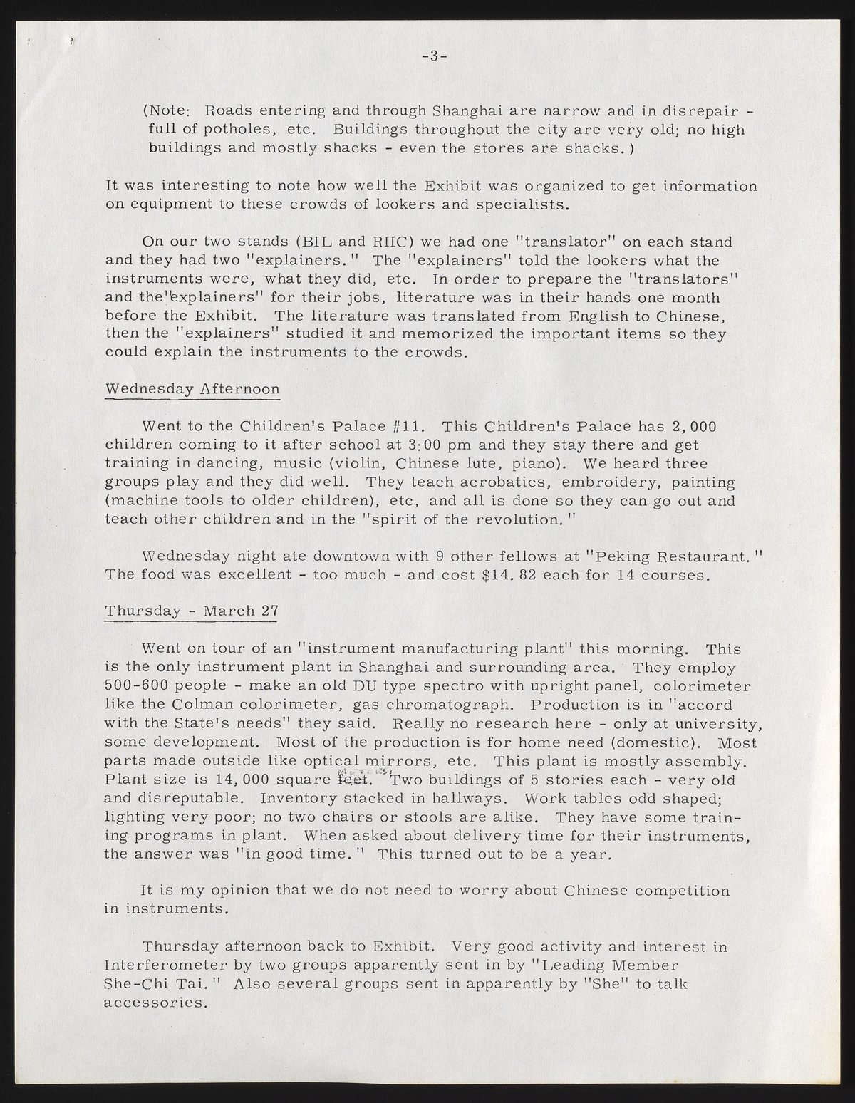 While in China, Cherniss met with representatives of Machimpex, Machinery Corporation, Chemical Corporation, and East Asiatic Corporation to discuss potential sales. He toured a plant manufacturing spectrophotometers, colorimeters, and gas chromatographs; unimpressed by the physical condition of the facility and the reported delivery time for instruments, he wrote that “we do not need to worry about Chinese competition in instruments."