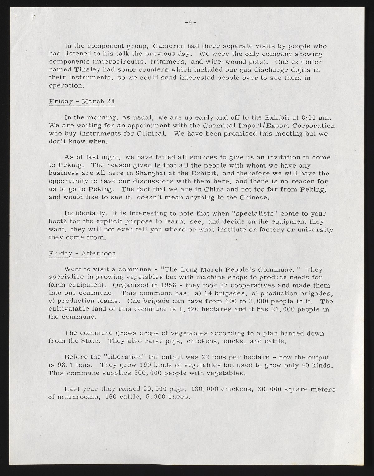 While in China, Cherniss met with representatives of Machimpex, Machinery Corporation, Chemical Corporation, and East Asiatic Corporation to discuss potential sales. He toured a plant manufacturing spectrophotometers, colorimeters, and gas chromatographs; unimpressed by the physical condition of the facility and the reported delivery time for instruments, he wrote that “we do not need to worry about Chinese competition in instruments."
