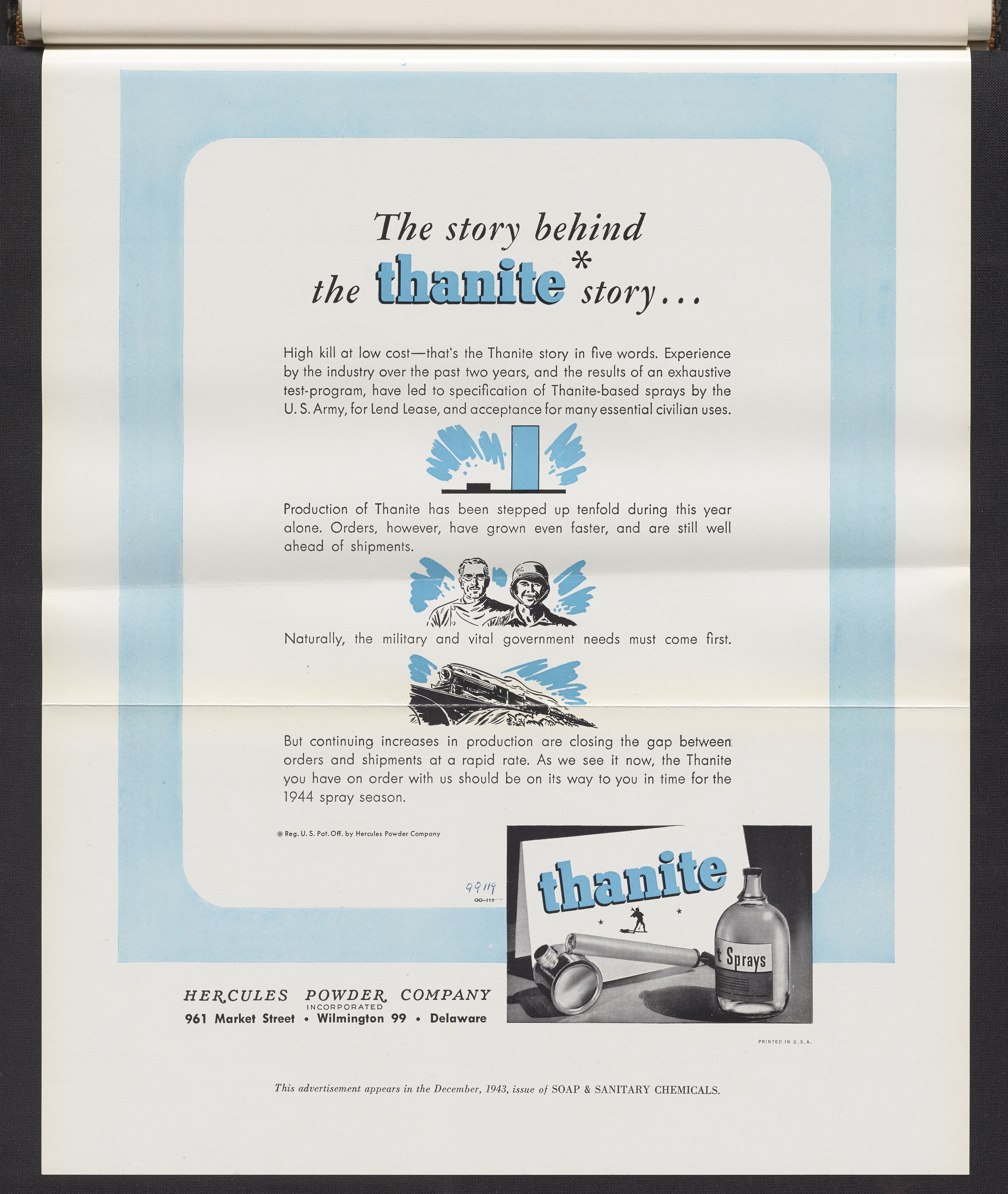 Advertisement for Thanite, a toxicant manufactured and sold by the Hercules Powder Company for use in pesticides and insecticides. This advertisement appeared in the December 1943 issue of Soap & Sanitary Chemicals.