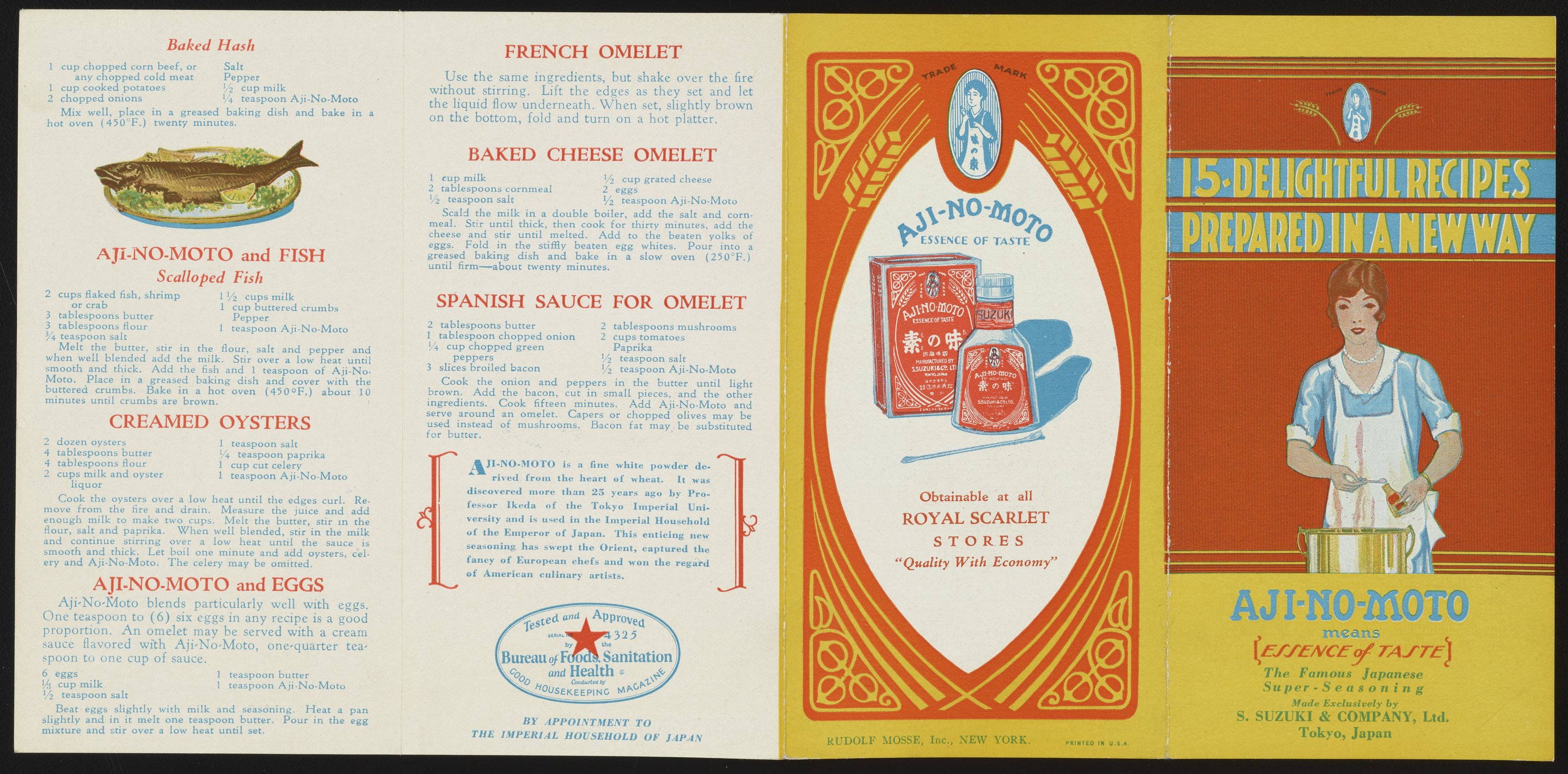 Promotional pamphlet Aji-No-Moto, a mono sodium glutamate (MSG) food additive product manufactured by S. Suzuki & Co., Ltd. Designed to market Aji-No-Moto to housewives, the pamphlet includes recipes for a variety of dishes and sauces, including soup, spaghetti, and omelets, purportedly enhanced by the addition of Aji-No-Moto.