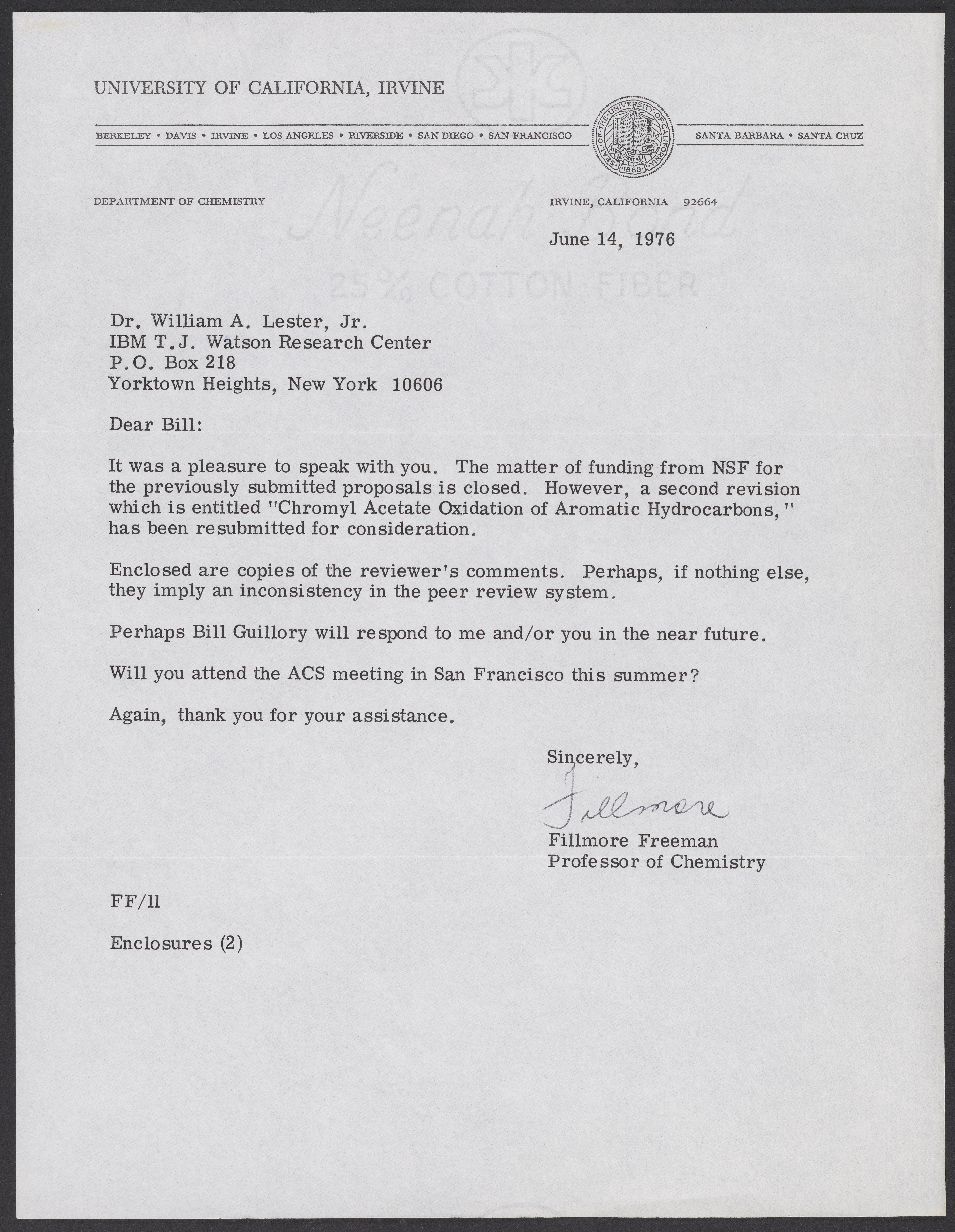 Letter from Fillmore Freeman (1936-), a professor of chemistry at University of California, Irvine, to William A. Lester, Jr. (1937-) about funding proposals submitted to the National Science Foundation (NSF).