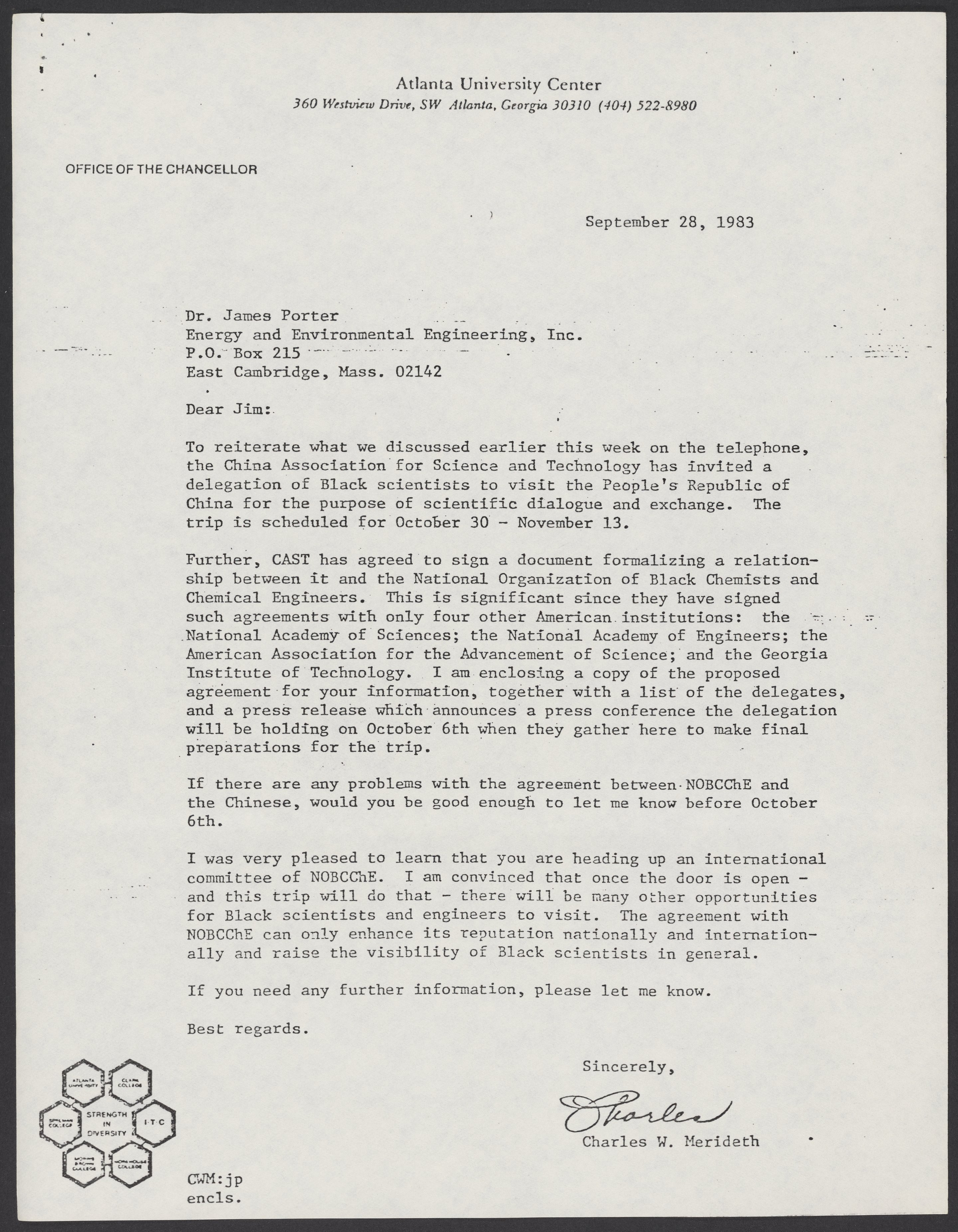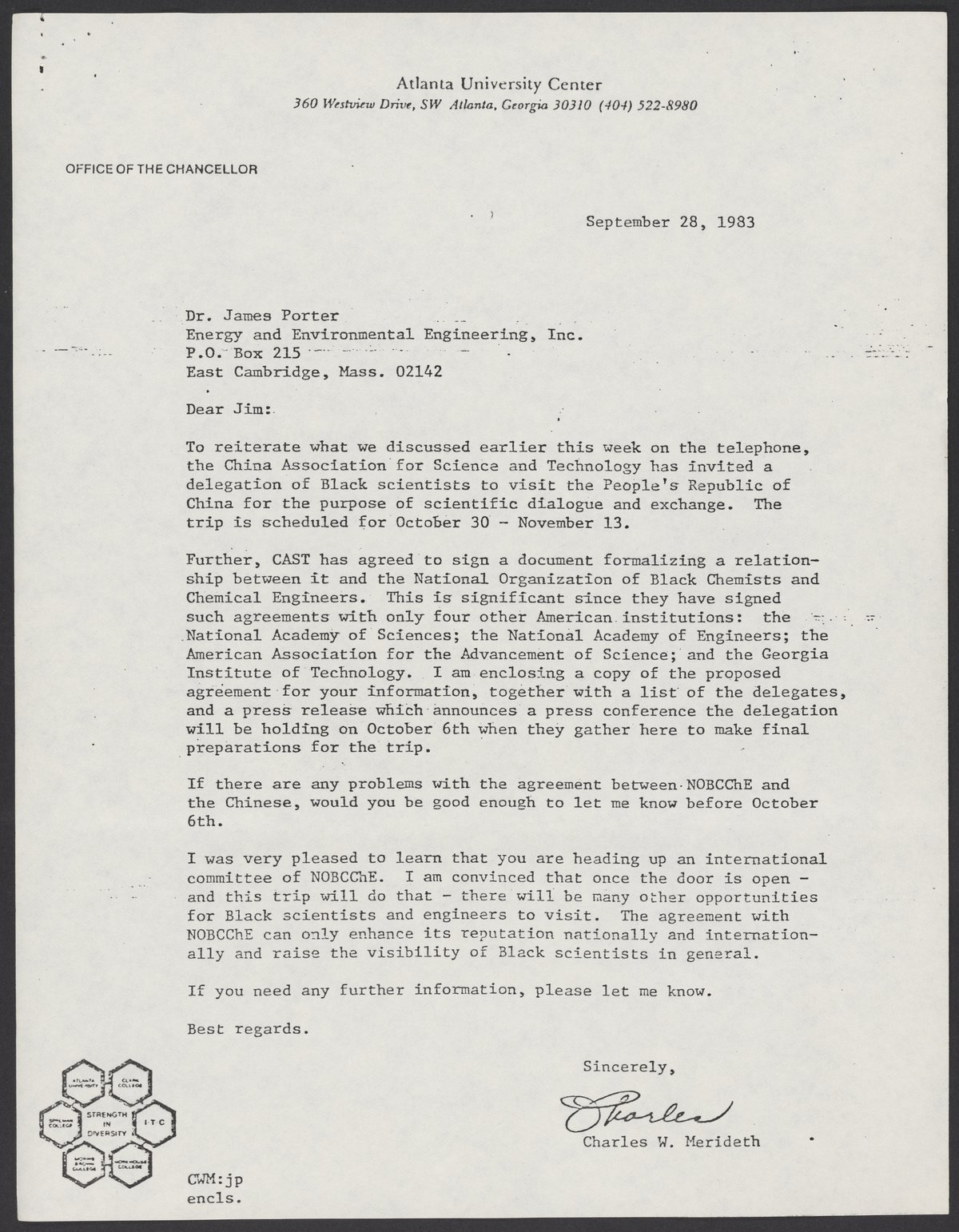 Letter from Charles W. Merideth (1940-2019) to James Porter about creating a formal relationship between the China Association for Science and Technology (CAST) and the National Organization for the Professional Advancement of Black Chemists and Chemical Engineers (NOBCChE).