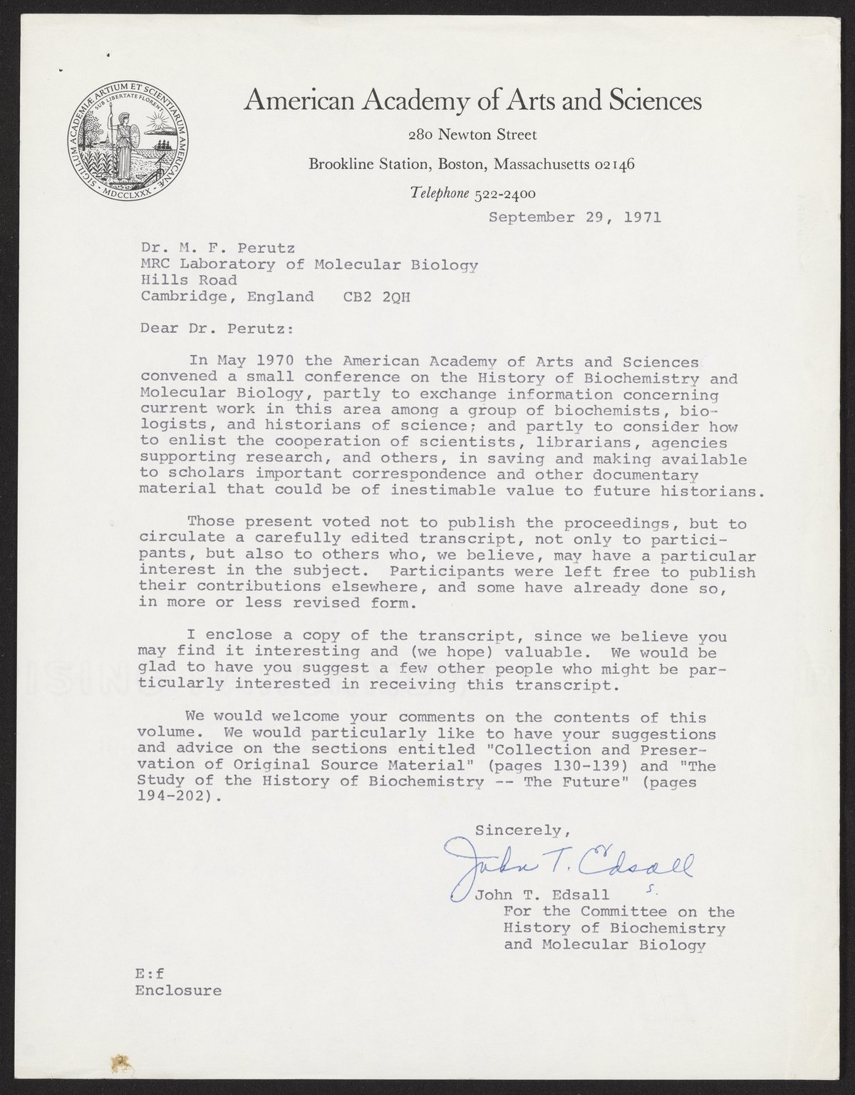 Letter from John T. Edsall to Max Perutz, September 29, 1971
