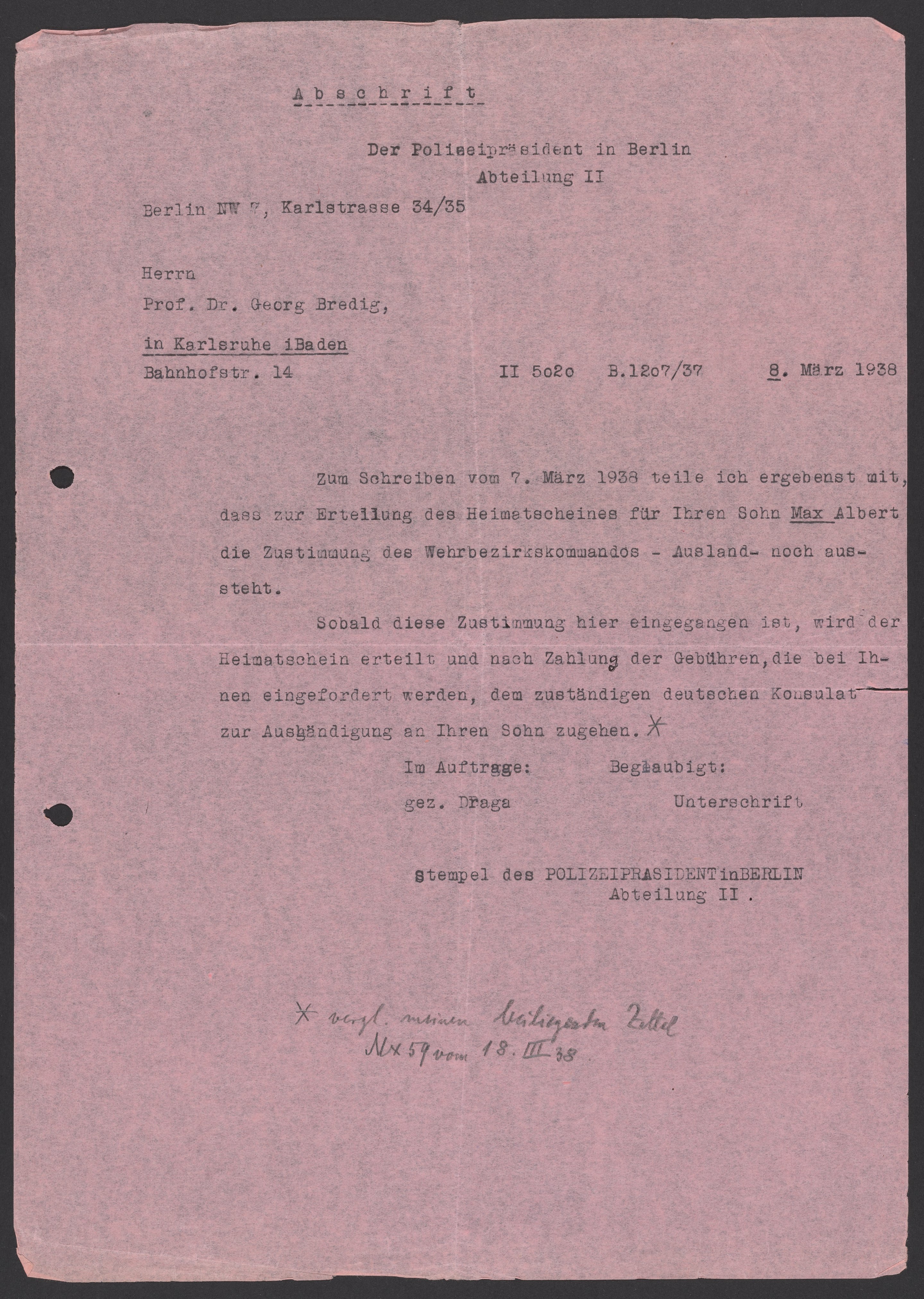 Letter from the chief of police in Berlin to Georg Bredig