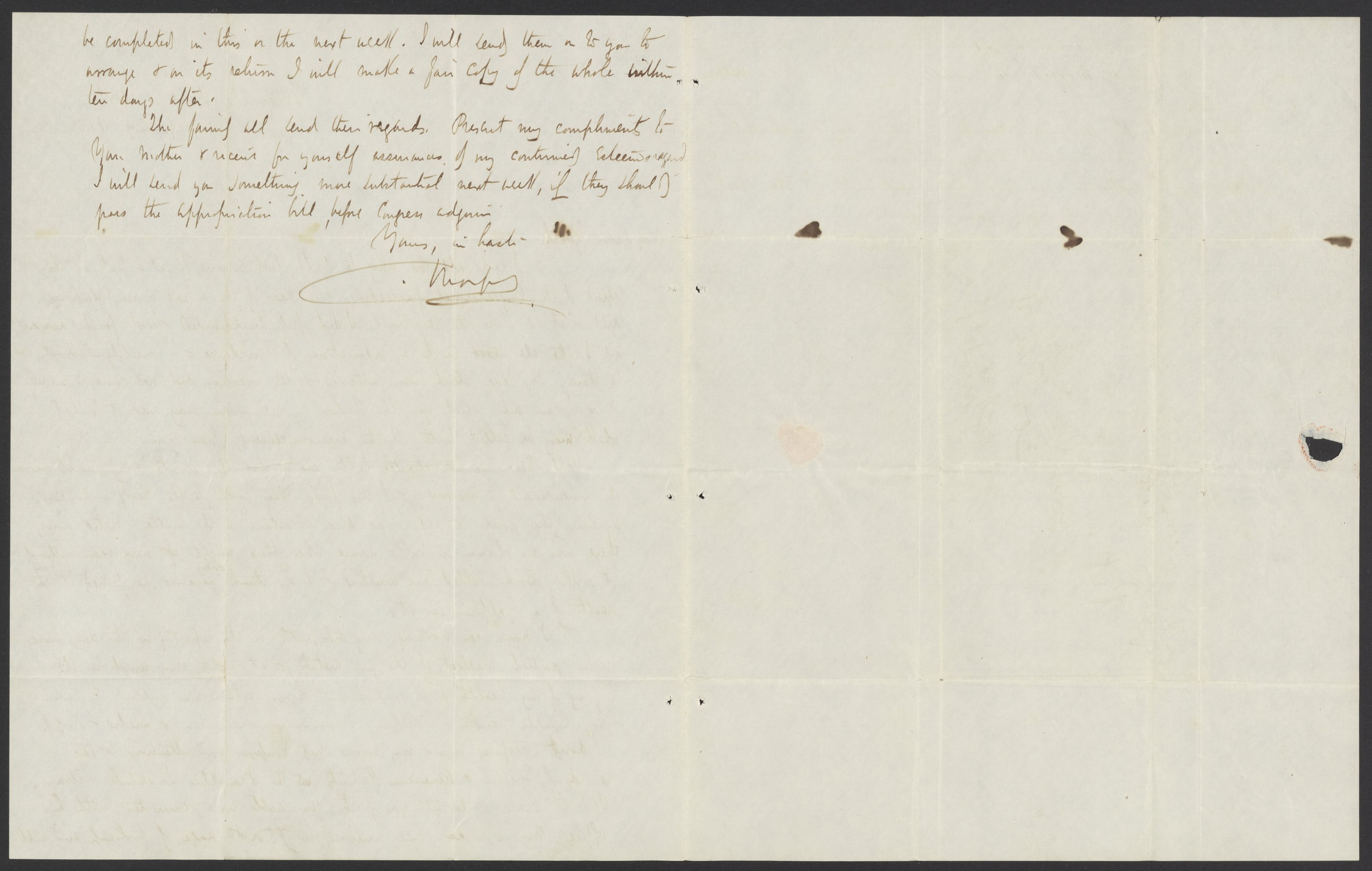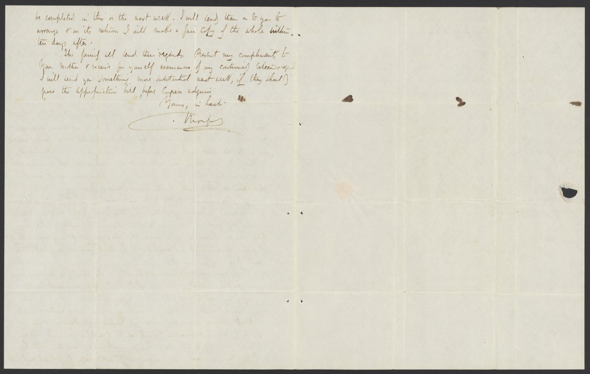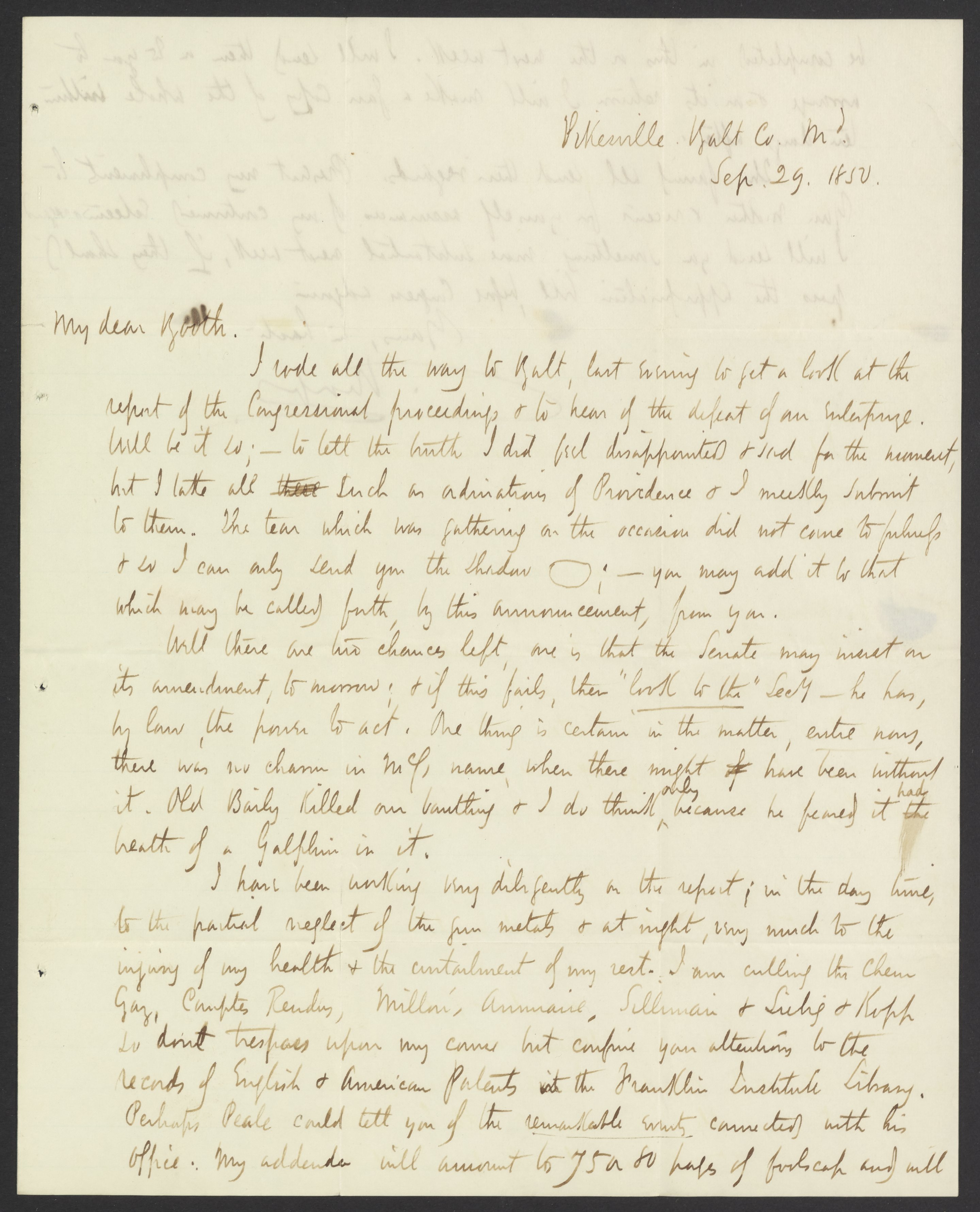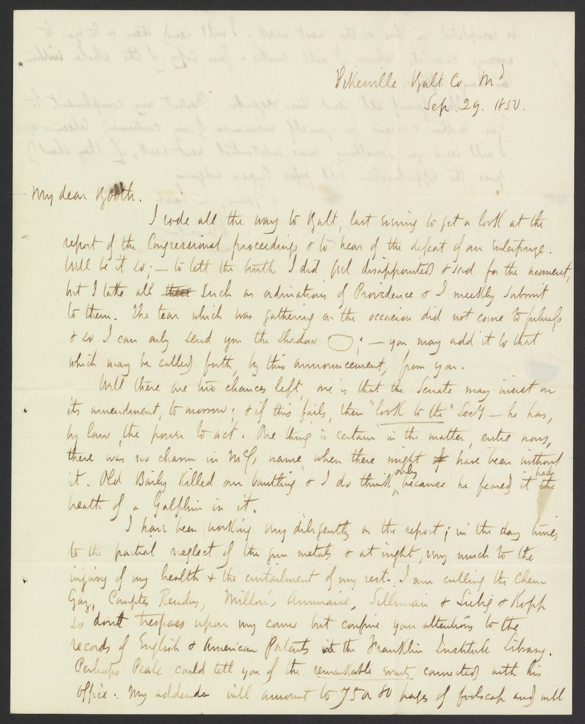 Small JPG1200 x 1484px — 225 KBLarge JPG2880 x 3561px — 894 KBFull-sized JPG3298 x 4078px — 1.1 MBOriginal fileTIFF — 3298 x 4078px — 38.5 MBCampbell Morfit (1820-1897), a distinguished chemist and co-editor with James Curtis Booth (1810-1888) of the Encyclopedia of Chemistry (1850), writes to Booth to discuss the fate of some legislation.