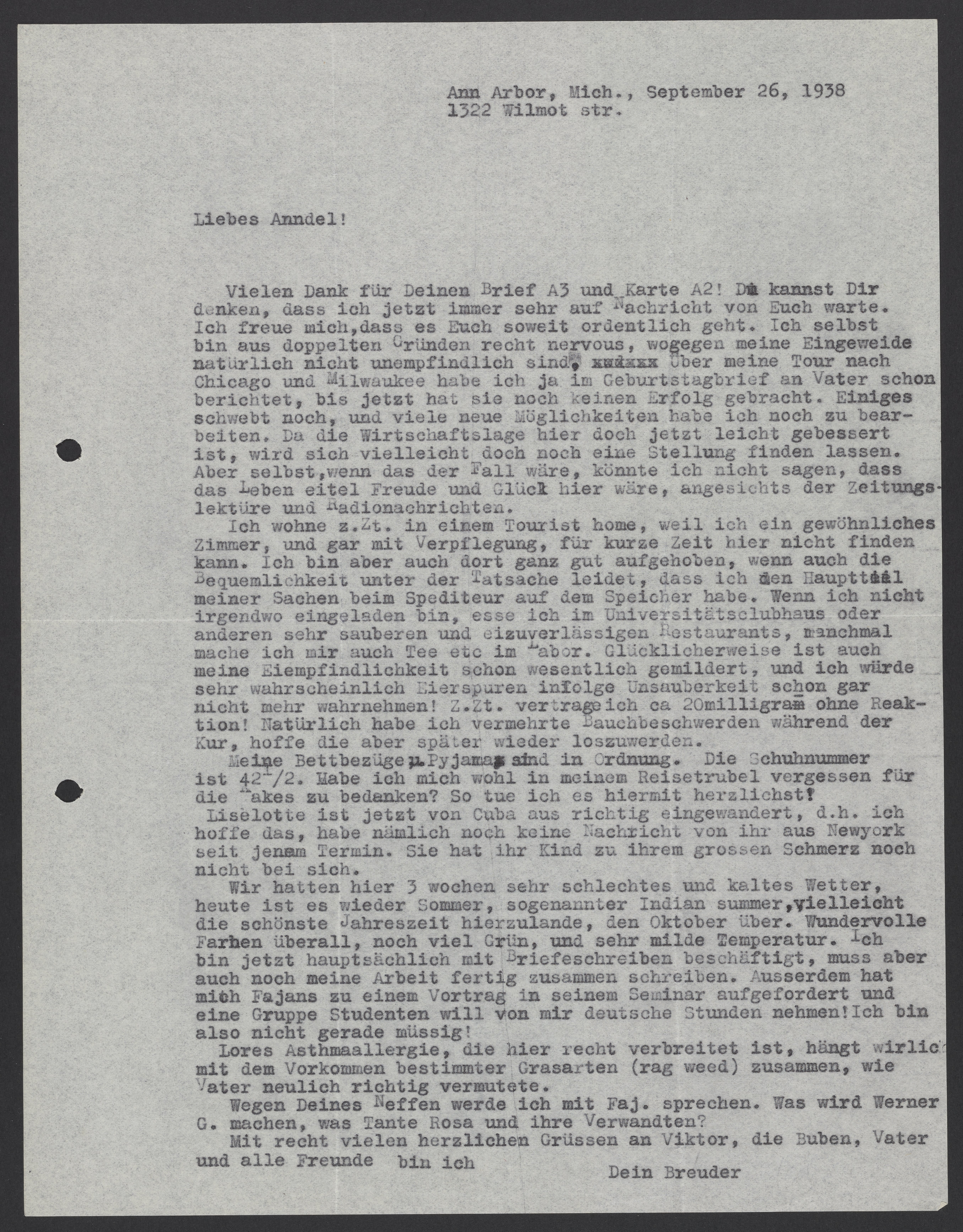 Max Bredig (1902-1977) updates his sister, Marianne Homburger (1902-1987), on his new life in Ann Arbor. Michigan. He additionally discusses American employment prospects and inquires about the well-being of his extended family in Germany.