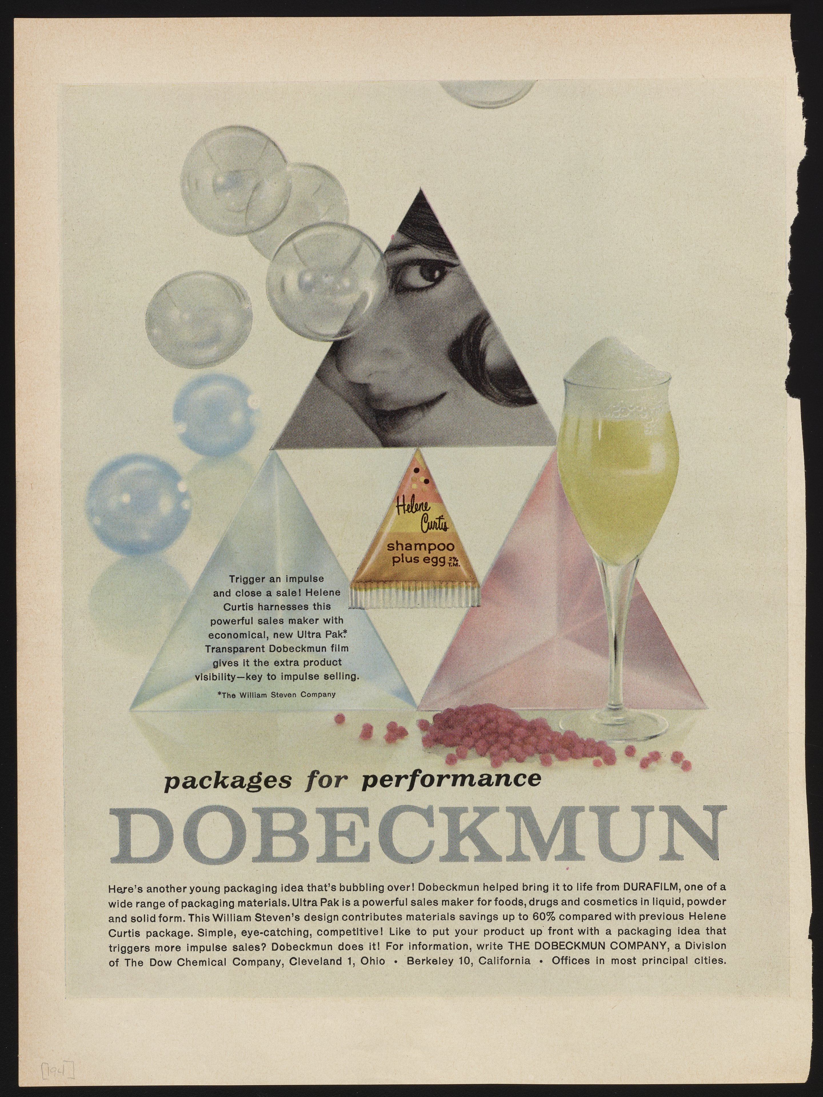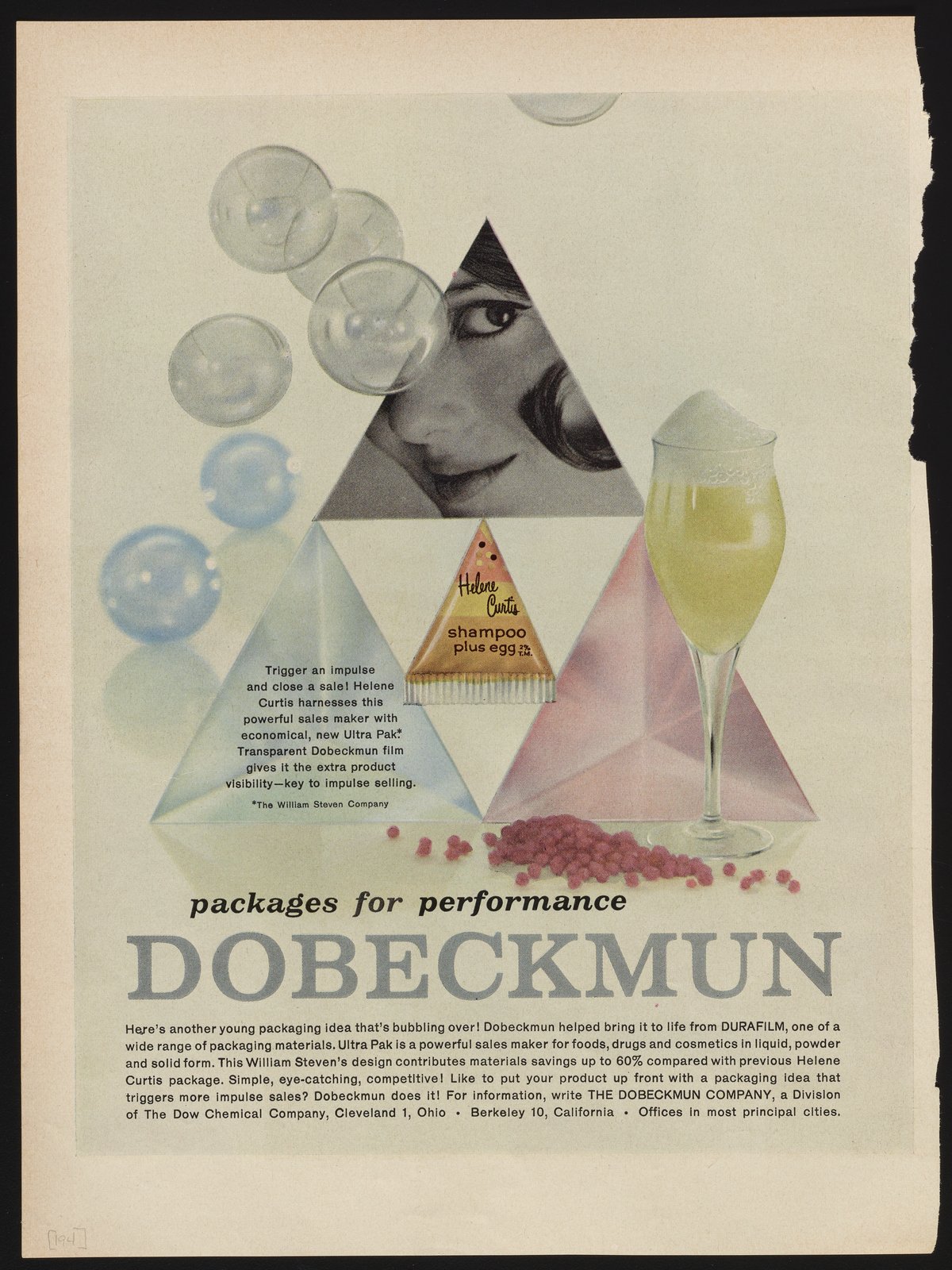 Color print advertisement for Durafilm, a transparent film manufactured and sold by the Dobeckmun Company, a division of the Dow Chemical Company based in Cleveland, Ohio. The advertisement details the use of Durafilm to create the new Ultra Pak for use packaging food, drugs, and cosmetics in liquid, powder, and solid form. An image of Helene Curtis shampoo enclosed in the new Ultra Pak is featured at the center of the advertisement, with accompanying images of bubbles and an inset of a woman's face.