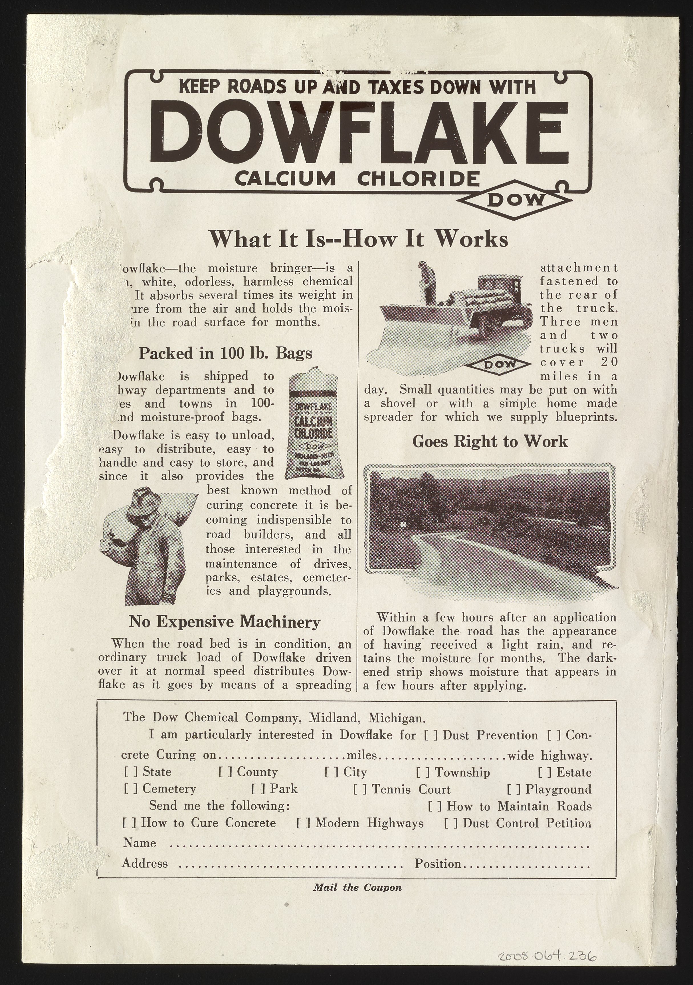 Sales pamphlet for Dowflake Calcium Chloride, a product of the Dow Chemical Company marketed for use to control dust on unpaved roads and parking lots, as well as a roadway deicer. The pamphlet details the nuisance of dust arising from the use of motor cars on unpaved roads and extols the benefits of using Dowflake as a surface treatment to lock in moisture and reduce the maintenance and upkeep required of unpaved roads and drives.