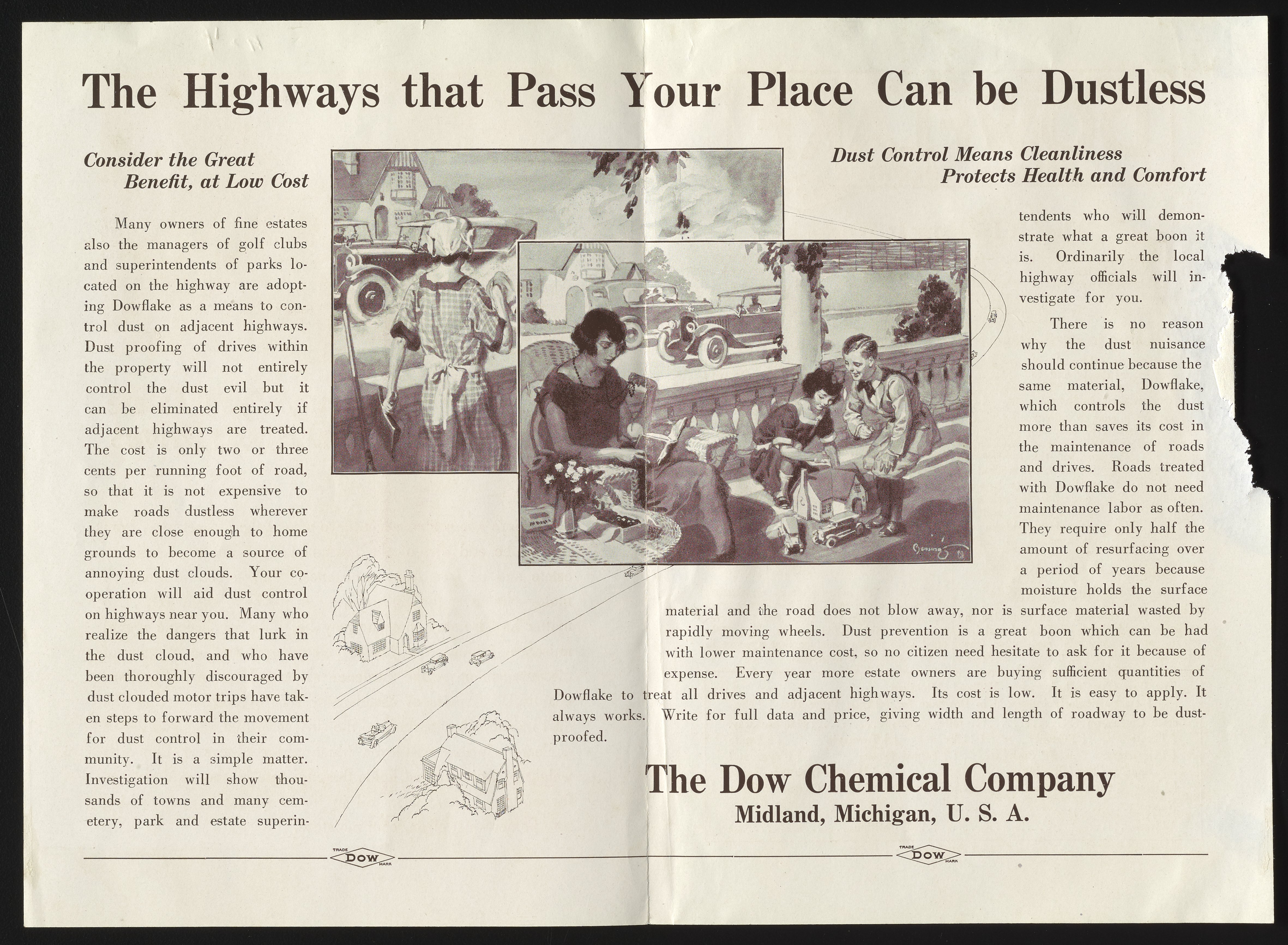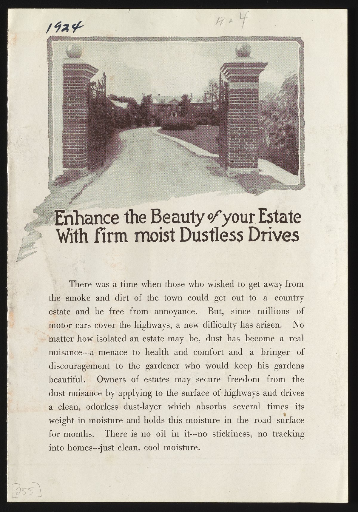 Dow Chemical Company. “Enhance the Beauty of Your Estate With Firm Moist Dustless Drives,” 1924. Advertisements from the Dow Chemical Historical Collection, Box 7. Science History Institute. Philadelphia. https://digital.sciencehistory.org/works/6q182k762.