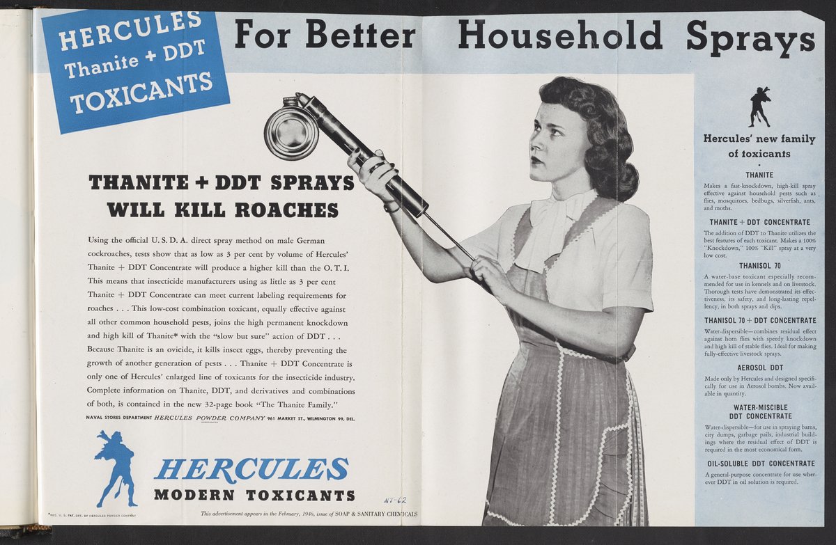 Hercules Incorporated. “Hercules Thanite + DDT Toxicants, For Better Household Sprays.” 1946 Hercules Advertisements, 1946. Records of Hercules Incorporated, Volume 1946. Science History Institute. Philadelphia. https://digital.sciencehistory.org/works/6q182k80n.