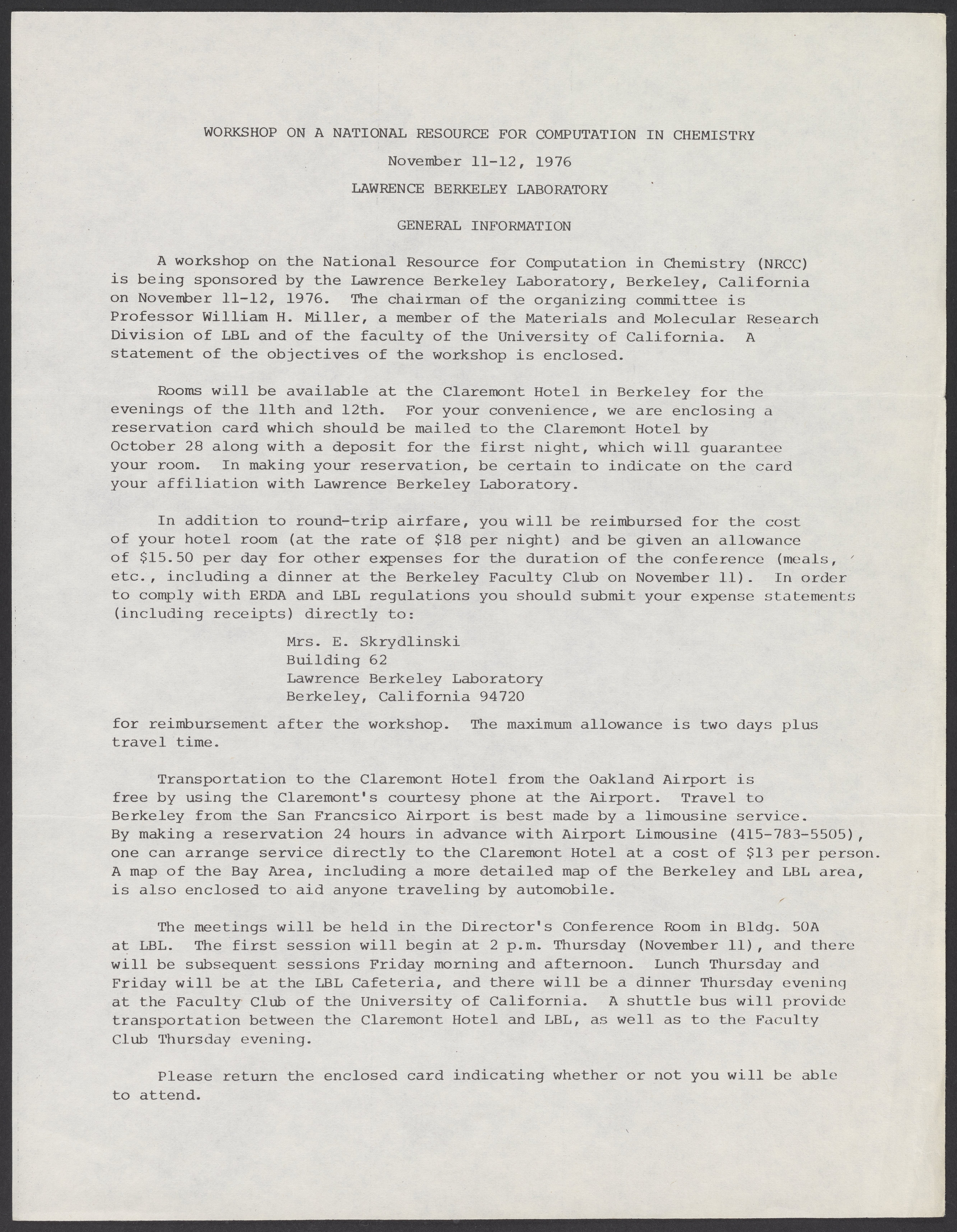 Overview of a workshop on the National Resource for Computation in Chemistry (NRCC) to be held at the Lawrence Berkeley Laboratory on November 11-12, 1976. Documents include the workshop objectives and travel information.