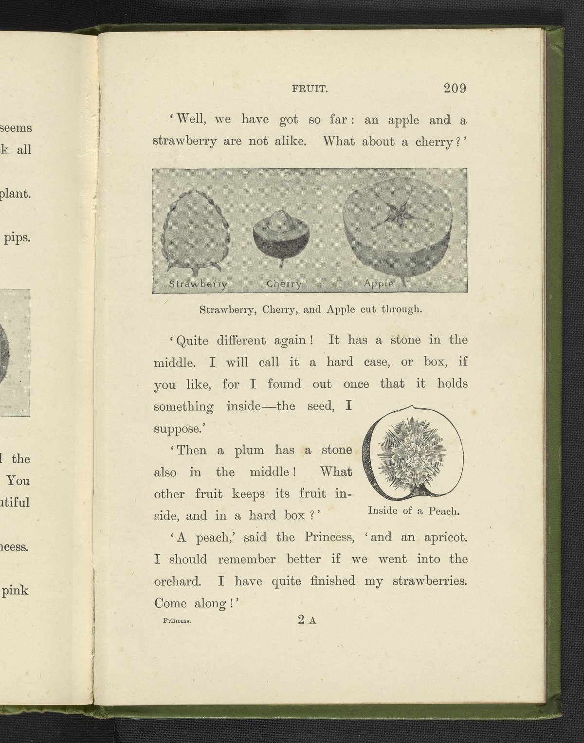 Martyn, Lily. “Strawberry, Cherry, and Apple Cut Through. Inside of a Peach.” Princess & Fairy, or, The Wonders of Nature. London, England: W. & R. Chambers Ltd., 1899. https://digital.sciencehistory.org/works/6qo91fs.