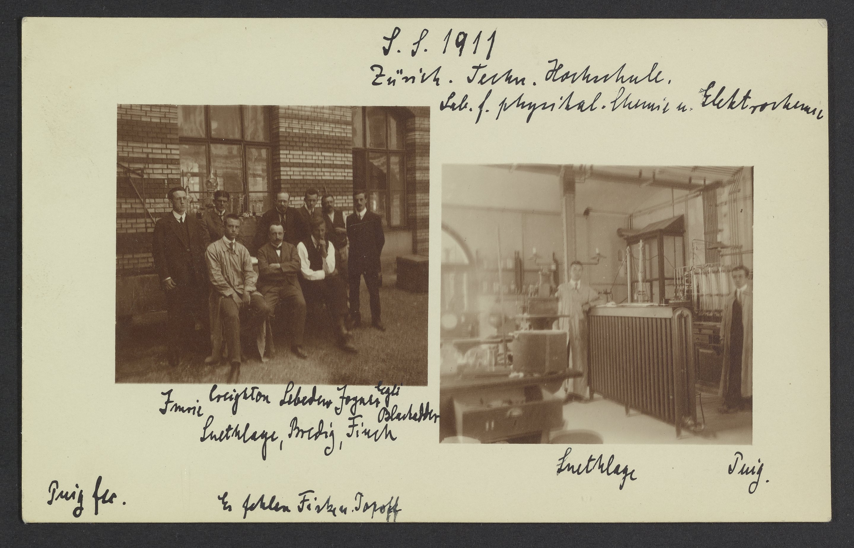 Two photographs of physical and electrochemists at the Technische Hochschule, in Zürich, Switzerland. A handwritten inscription indicates those pictured. The photo on the left includes from left to right standing, "I Morie", H. Jermain Creighton (1886-), Aleksandr Nikolaevich Lebedev (1869–1937), Jayner, J, Egli, Thomas Blackadder (1887-1953), and seated from left to right "Luethlage," Georg Bredig (1868-1944), and George Finch (1888-1970). The photograph of the right pictures from left to right "Luethlage" and "Tuig."