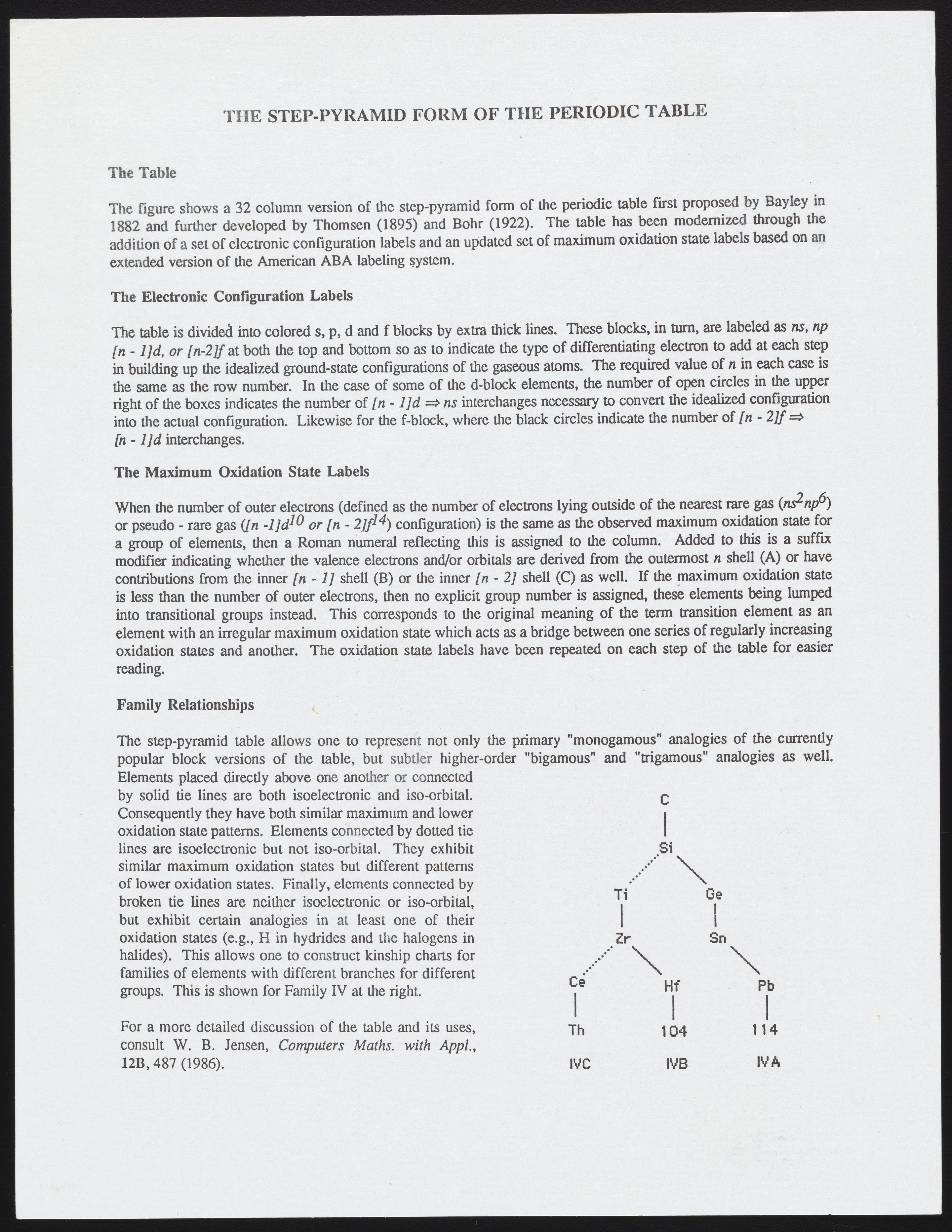 Jensen, William B. “The Step-Pyramid Form of the Periodic Chart.” Cheltenham (Township), Pennsylvania: Instruments for Research and Industry, 1987. Periodic Tables Collection, Box FC-5, Folder Periodic Tables (Assorted). Science History Institute. Philadelphia. https://digital.sciencehistory.org/works/6t053g96s.