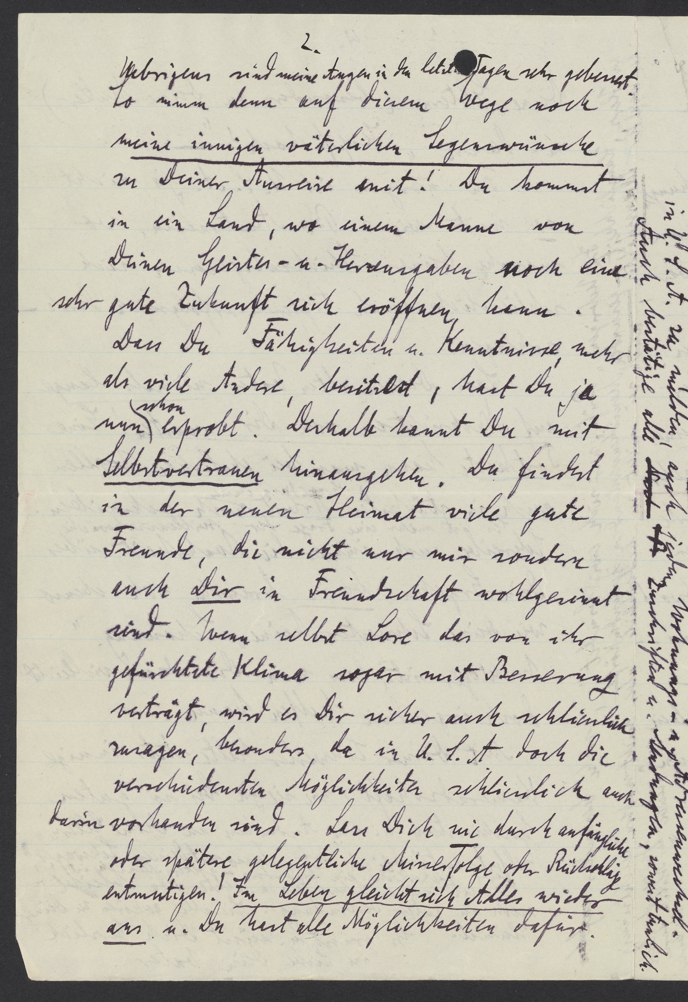 Uebrigens sind meine Augen in den letzten Tagen sehr gebessert. So nimm denn auf diesem Wege noch meine innigsten väterlichen Segenswünsche zu Deiner Ausreise mit! Du kommst in ein Land, wo einem Manne von Deinen Geistes- u. Herzensgaben noch eine sehr gute Zukunft sich eröffnen kann.