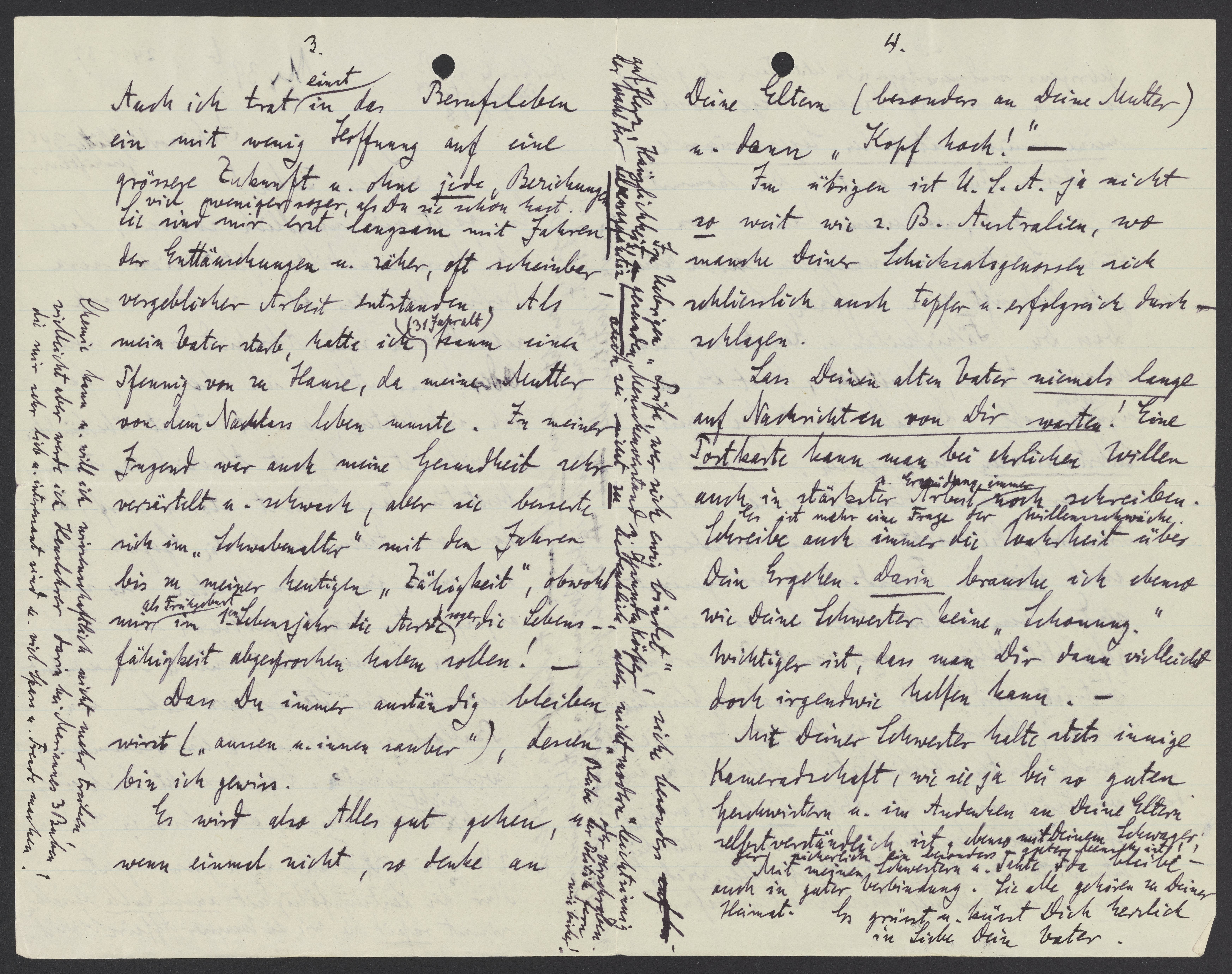 Im Uebrigen, „Prüfe, wer sich ewig bindet“, sich besonders auf Herz, Häuslichkeit, gesunden Menschenverstand u. gesunden Körper. Der Wahl der Lebensgefährtin, auch sei nicht zu bedenklich, aber nicht „sondern“ leichtsinnig oder verschroben. Bleibe der Politik fern wie bisher!