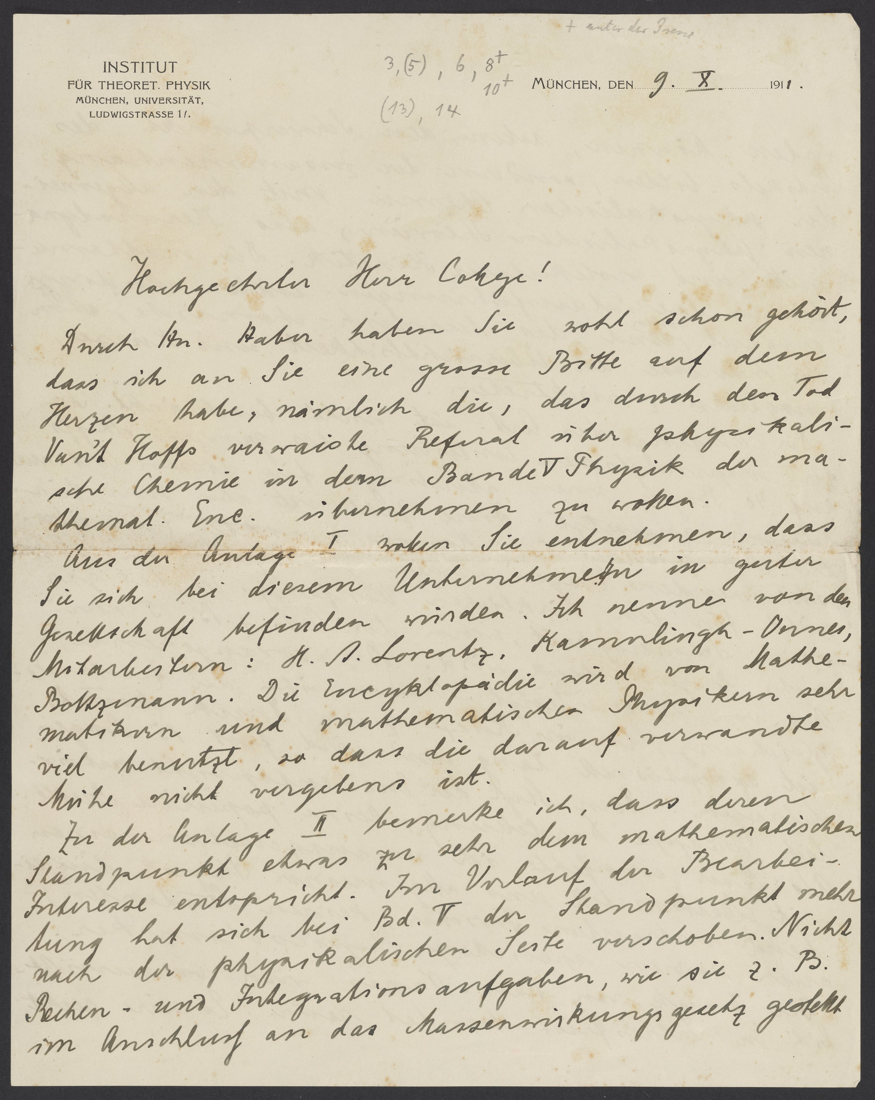 Durch Hn. Haber haben Sie wohl schon gehört, dass ich an Sie eine grosse Bitte auf dem Herzen habe, nämlich die , das durch den Tod Van’t Hoffs verwaiste Referat über physikalische Chemie in dem Bande V Physik der mathemat. Enc. übernehmen zu wollen.