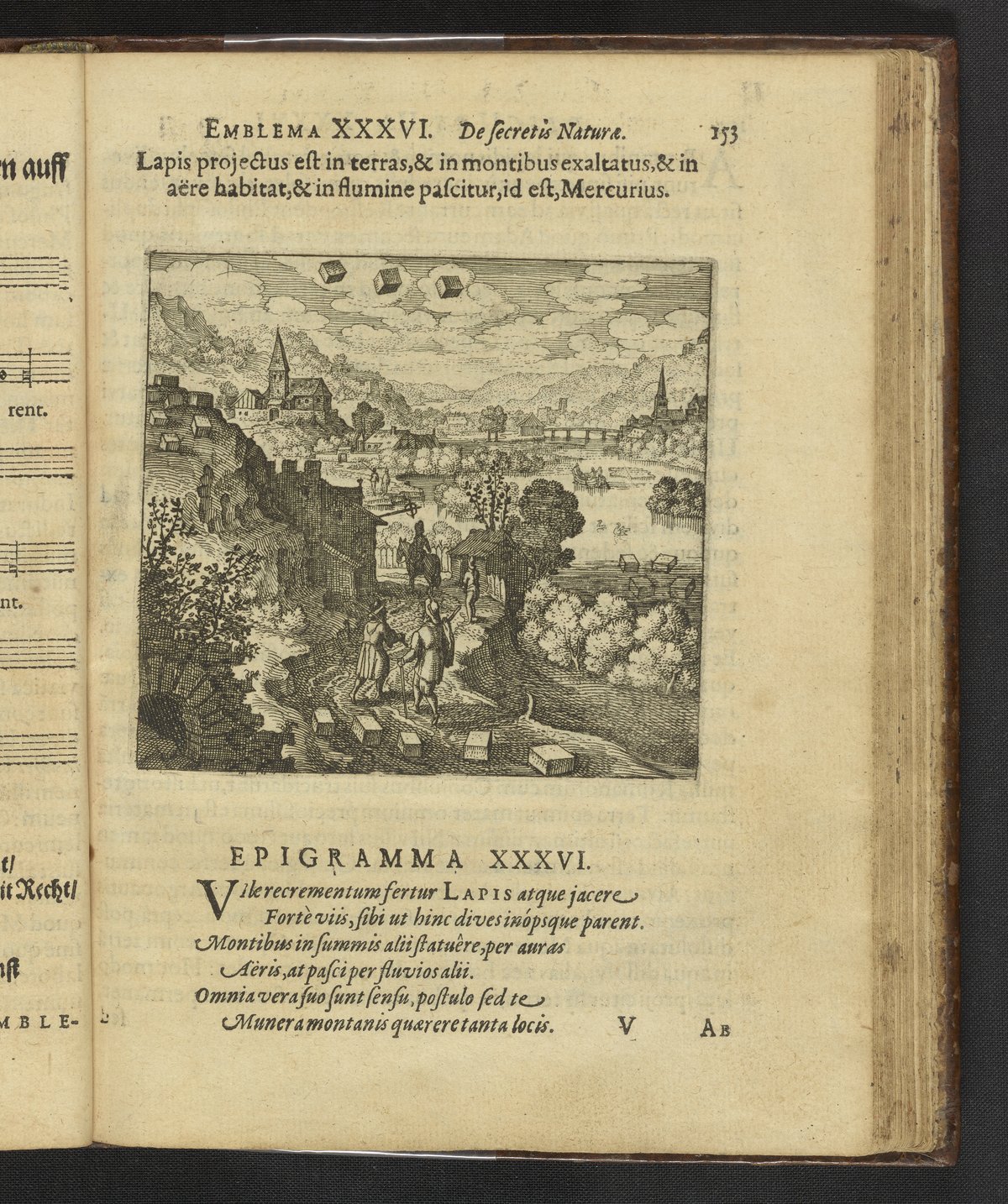 Emblem 36. The stone that is Mercury, is cast upon the land, lifted into the mountains, resides in the air, and nourished in the waters.