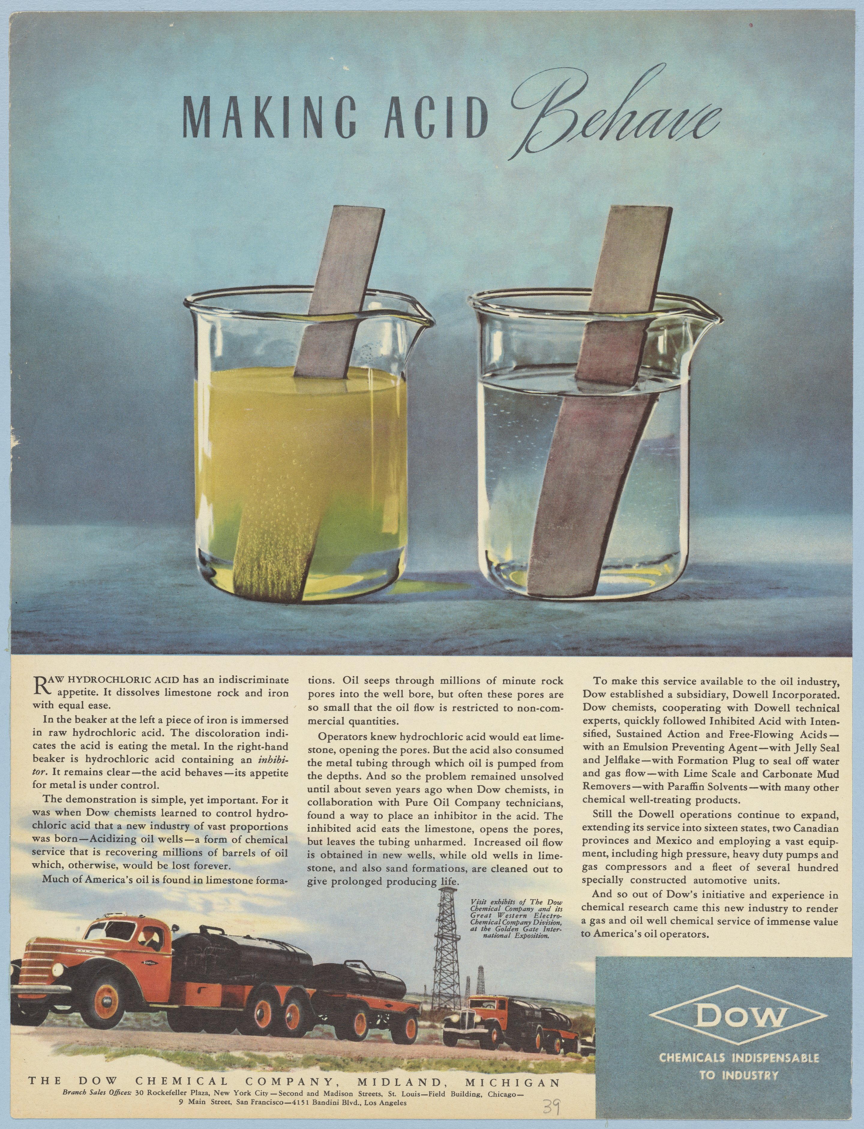 Dow Chemical Company. “Making Acid Behave,” August 1939. Advertisements from the Dow Chemical Historical Collection, Box 2. Science History Institute. Philadelphia. https://digital.sciencehistory.org/works/6w924d168.