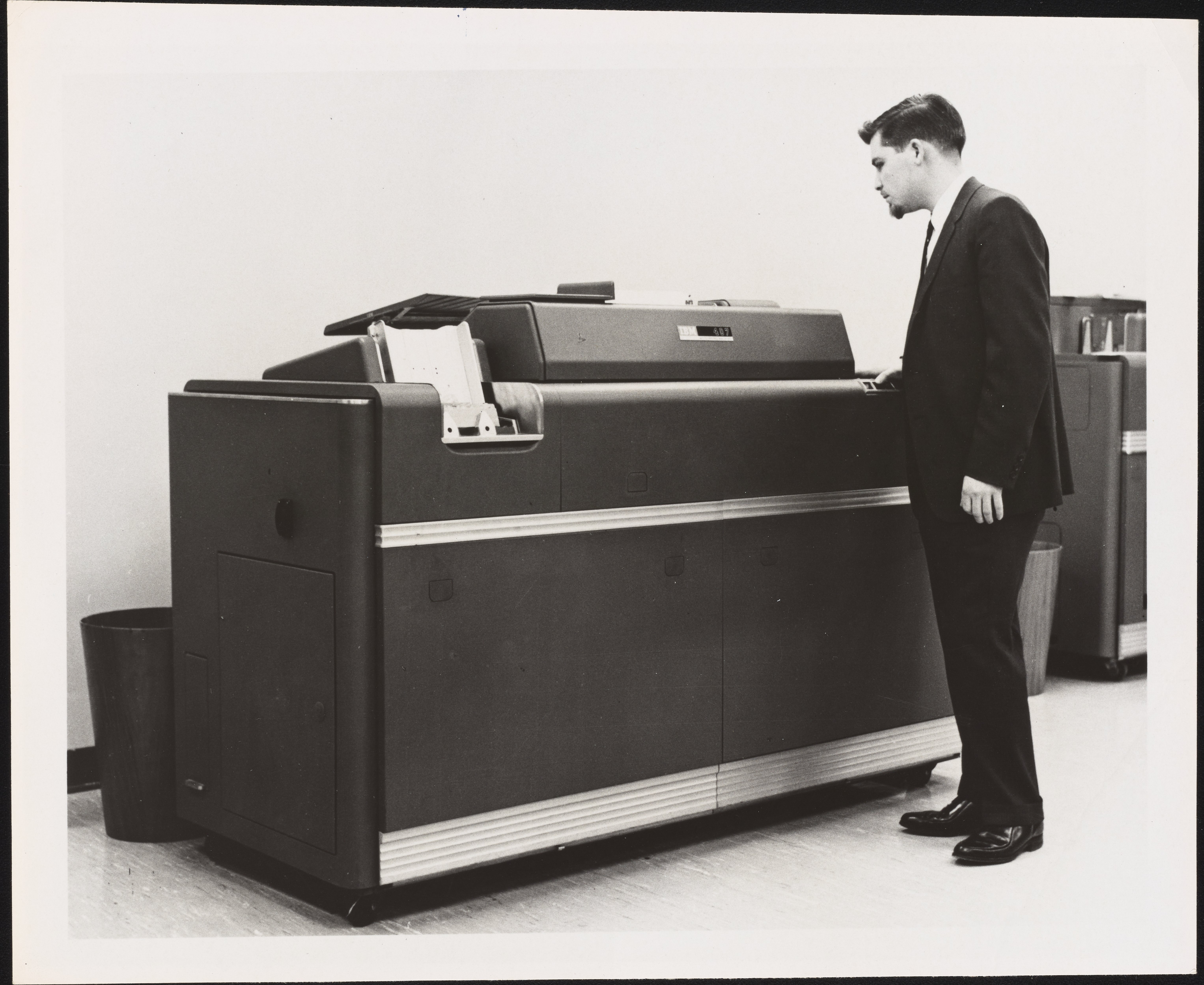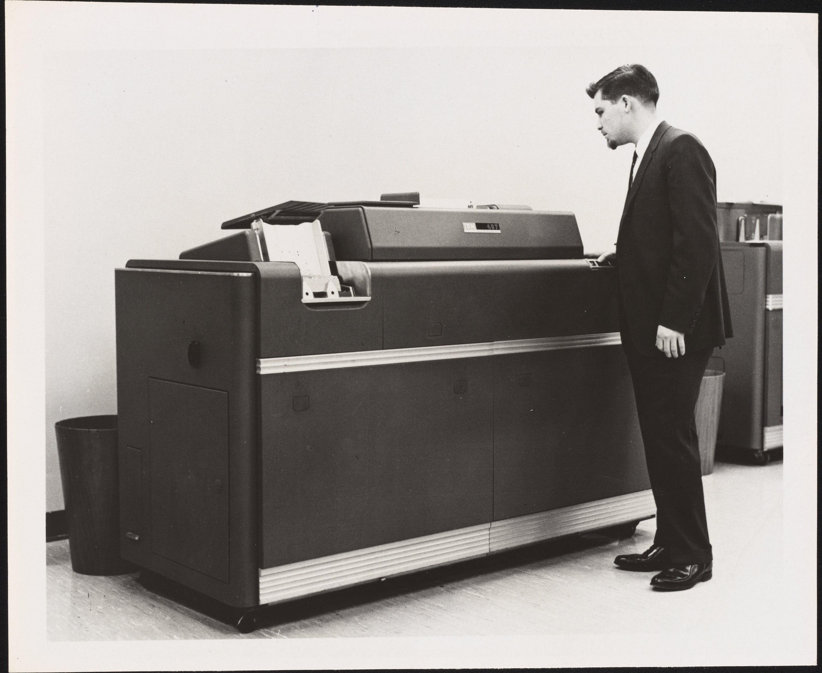 A black and white photograph of an unidentified man standing next to an IBM 407 Accounting Machine. Introduced in 1949, the IBM 407 was one of a long line of IBM tabulating machines. The 407 read punched cards, totaled fields on the cards, made simple decisions, printed results, and, with the aid of a summary punch, output results on punched cards that could be input to other processing steps.