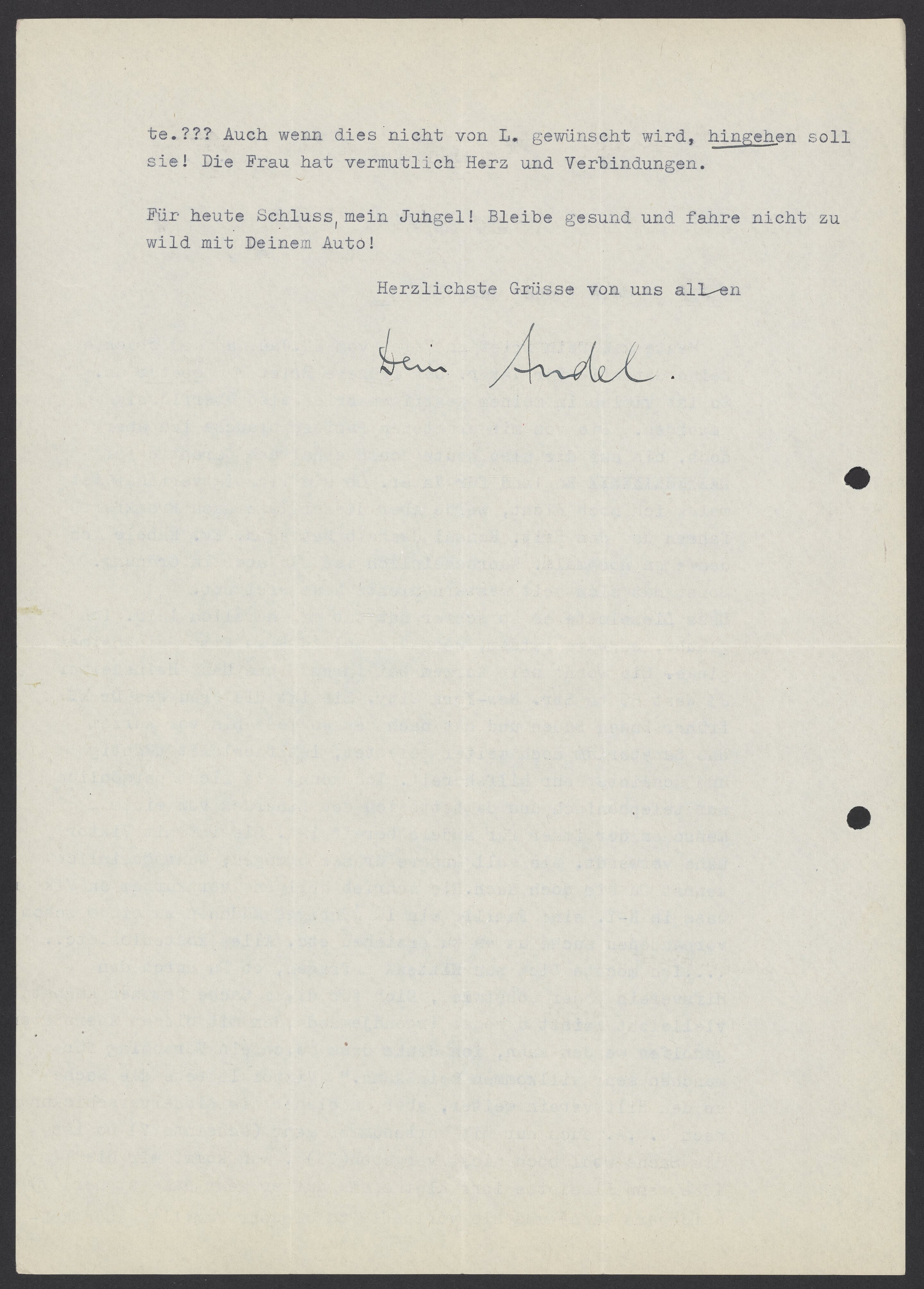 Dass Lieselotte es so schwer hat, tut mir herzlich leid. Ich glaube, es wäre ratsam, wenn sie mal zu Frau Emma Heinsheimer 23 West 85th Str. New York City. Sie ist die Frau des Dr. H. früher Baden Baden und hat nach dessen Tode bis vor Kurzem das Sanatorium noch weiter geleitet, ist fabelhaft tüchtig und scheint sehr hilfsbereit. Ich kenne sie nicht persönlich, nur telephonisch, und da hatte ich den Eindruck von einem Menschen, der immer für andere bereit ist. Sie ist mit Viktor nahe verwandt. Sie solle unsere Grüße bringen, wahrscheinlich kennst Du sie doch auch. Sie schrieb übrigens vor kurzem an Viktor, dass in N-Y. eine Familie ein 10-jahriges Mädchen zu einem schon vorhandenen suche, um es zu erziehen etc. Alles kostenlos etc…