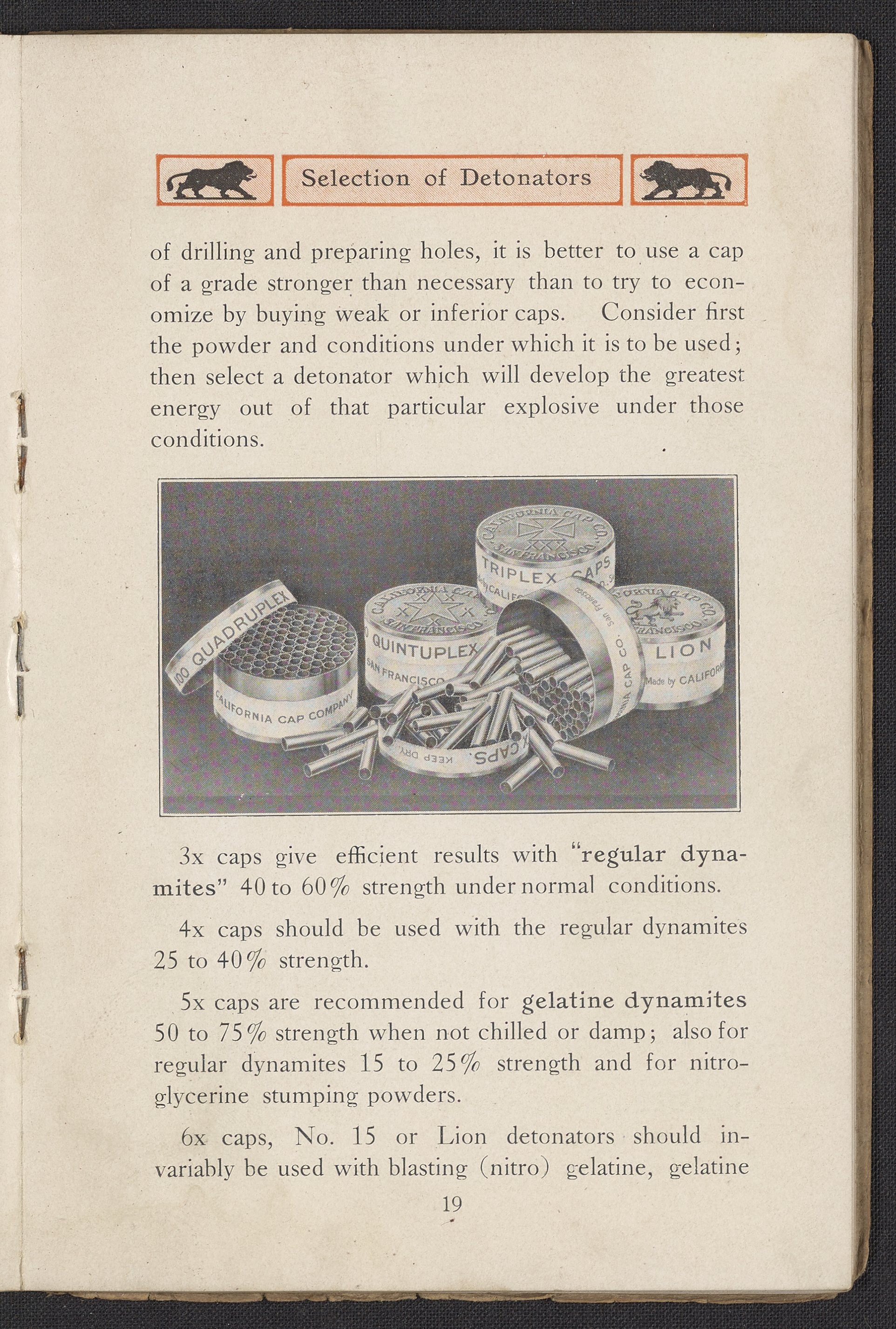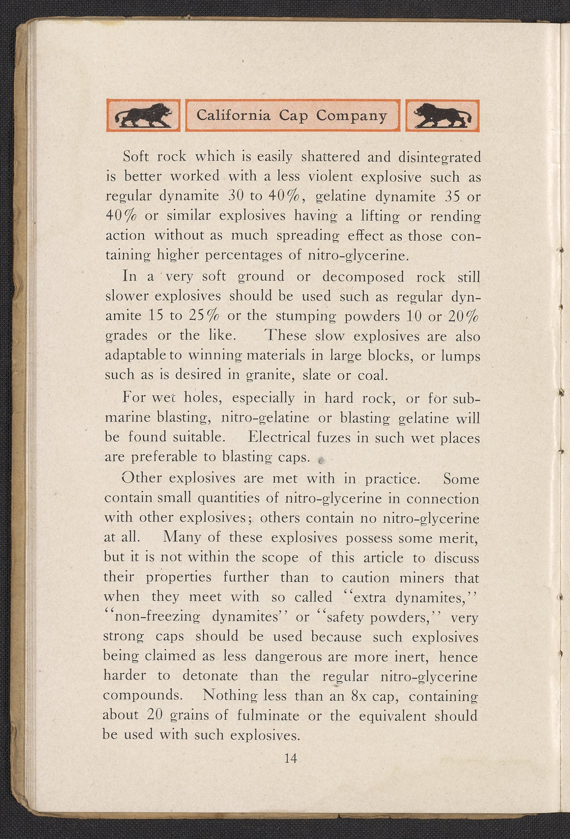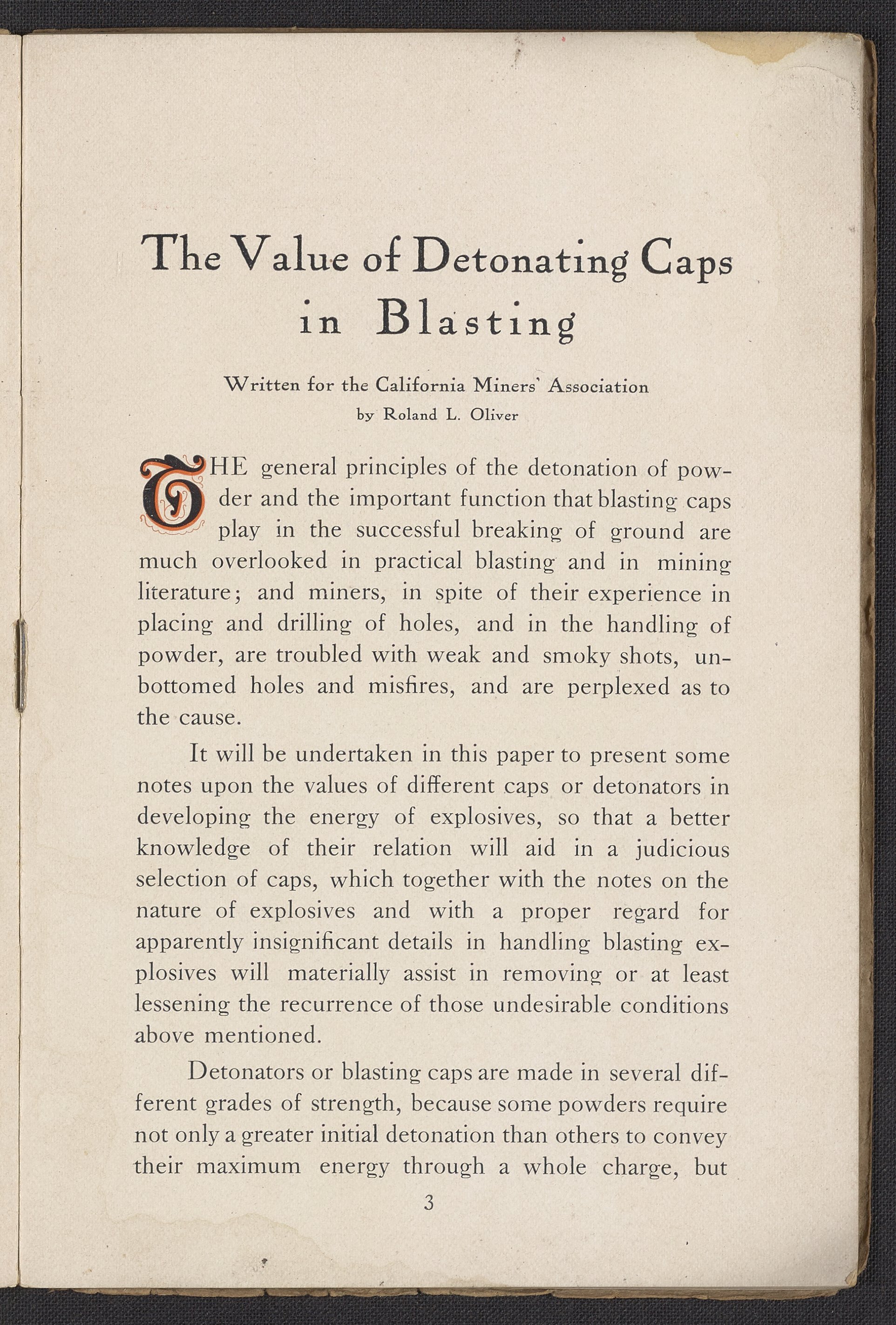 Small JPG1200 x 1732px — 444 KBFull-sized JPG1991 x 2873px — 1.1 MBOriginal fileTIFF — 1991 x 2873px — 16.4 MBThird edition of a work produced by the California Cap Company, the first U.S. manufacturing company of blasting caps and explosives for use in mining. The California Cap Company was founded in 1877 by William Letts Oliver (1844-1918) and Freeborn Fletter (-1899). It was the major supplier of blasting caps for the Western United States for many years until the company’s closure in 1940. The volume includes a paper written and read for the Fourteenth Annual Convention of the California Miners’ Association by Roland L. Oliver, The Value of Detonating Caps in Blasting. Contains sections concerning the strength of explosives, properties of detonating compounds; combustion, explosion, and detonation, proper care of fuses, and suggestions to ensure the best results in blasting. Work is digitized in its entirety.