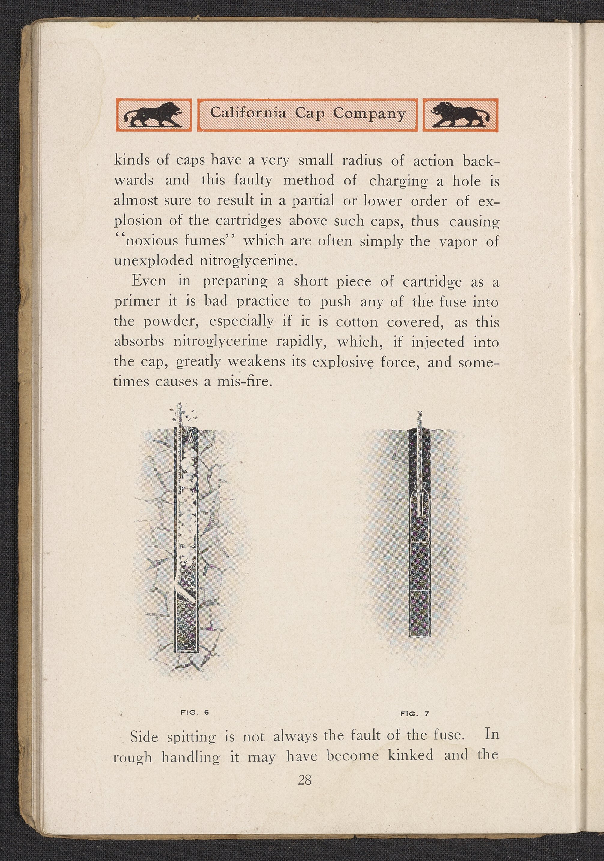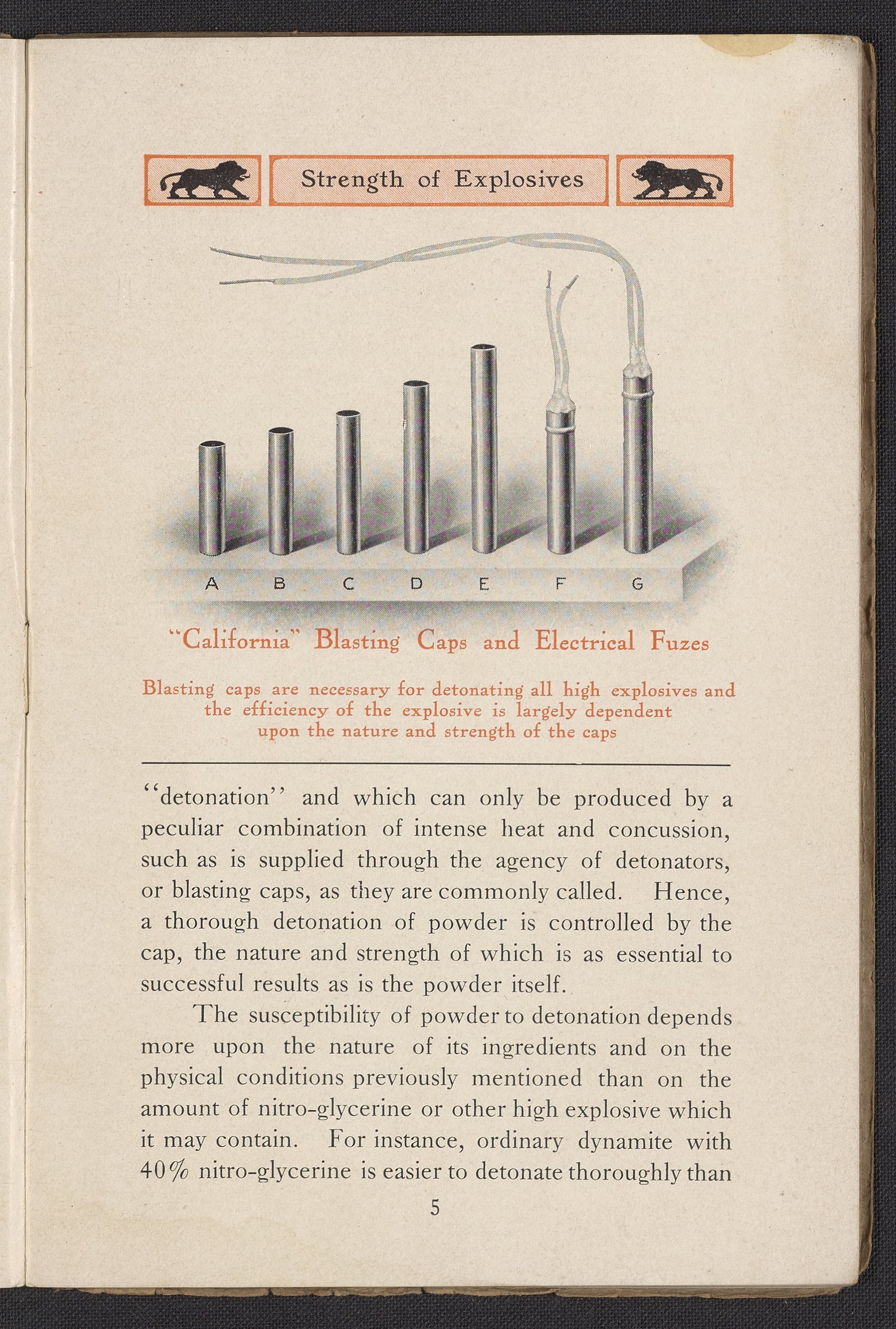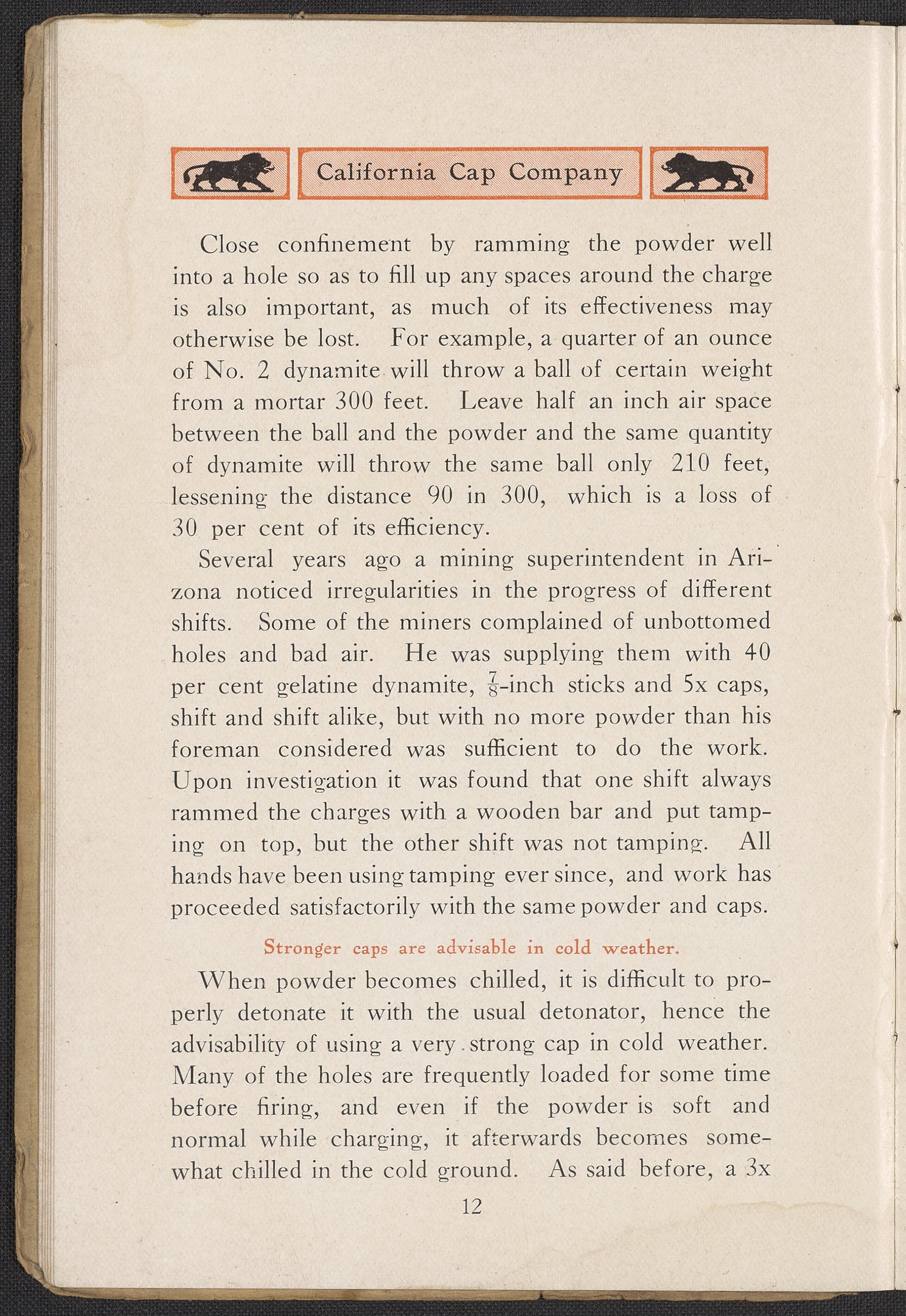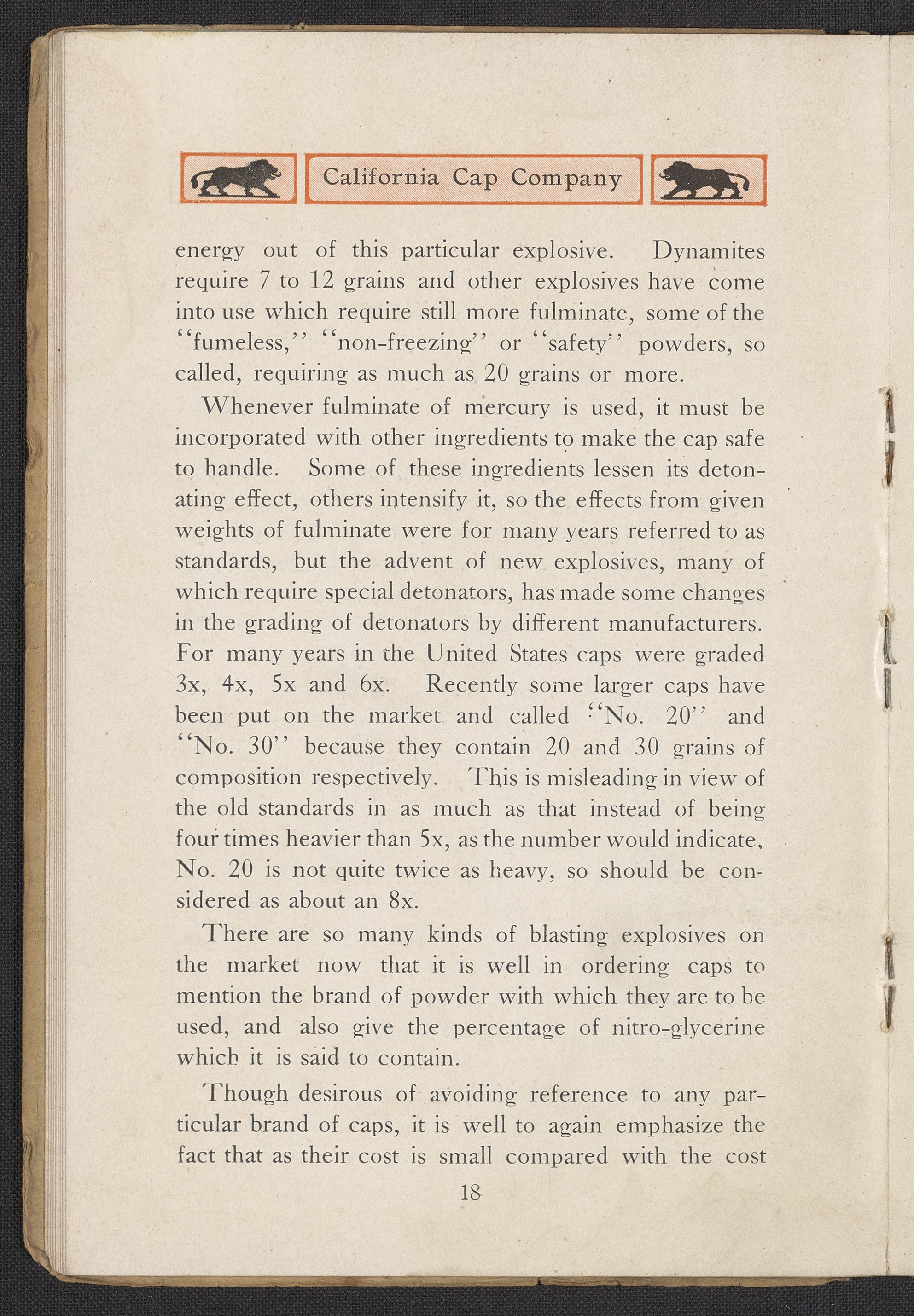 Small JPG1200 x 1732px — 444 KBFull-sized JPG1991 x 2873px — 1.1 MBOriginal fileTIFF — 1991 x 2873px — 16.4 MBThird edition of a work produced by the California Cap Company, the first U.S. manufacturing company of blasting caps and explosives for use in mining. The California Cap Company was founded in 1877 by William Letts Oliver (1844-1918) and Freeborn Fletter (-1899). It was the major supplier of blasting caps for the Western United States for many years until the company’s closure in 1940. The volume includes a paper written and read for the Fourteenth Annual Convention of the California Miners’ Association by Roland L. Oliver, The Value of Detonating Caps in Blasting. Contains sections concerning the strength of explosives, properties of detonating compounds; combustion, explosion, and detonation, proper care of fuses, and suggestions to ensure the best results in blasting. Work is digitized in its entirety.