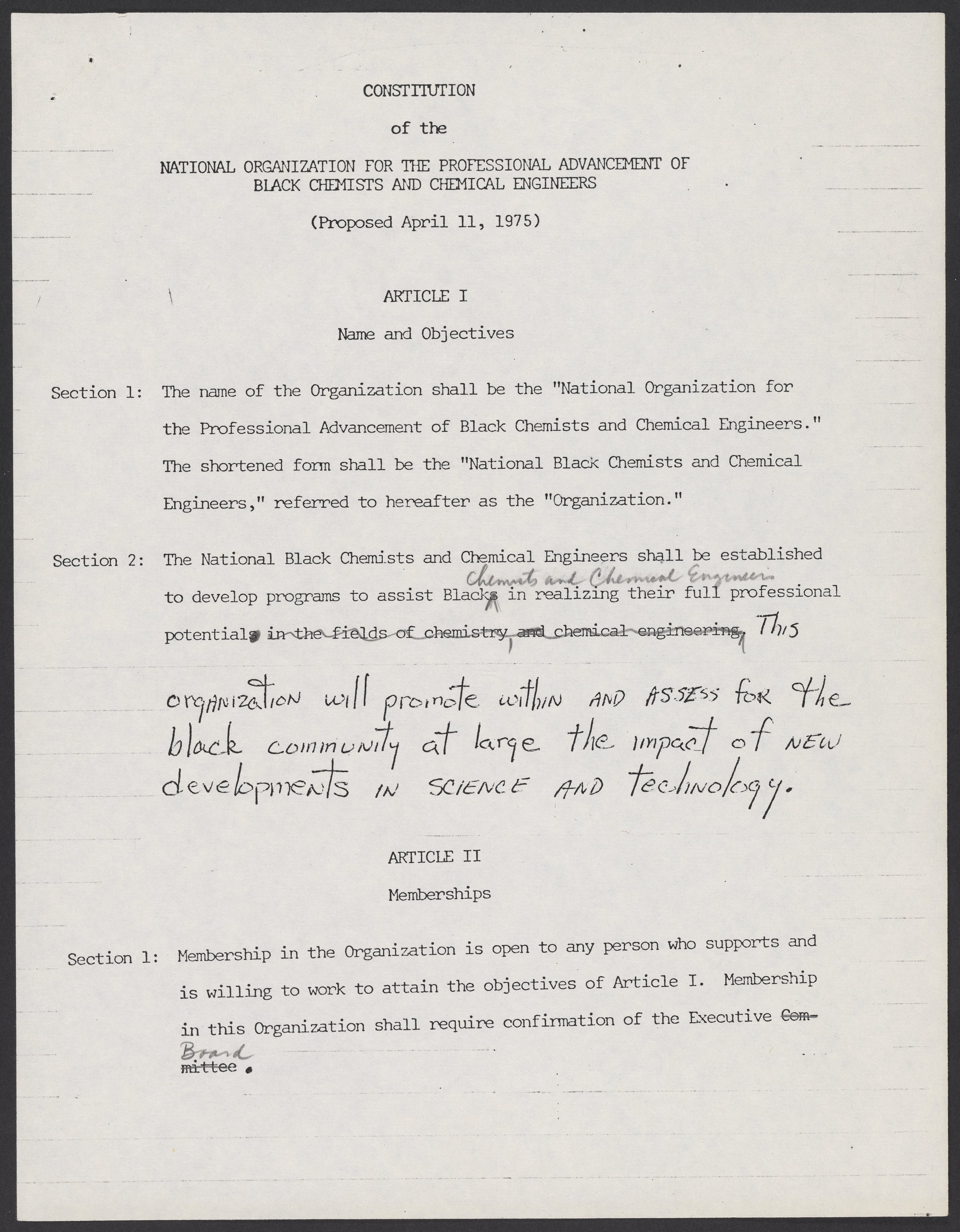 Draft of the Constitution of the National Organization for the Professional Advancement of Black Chemists and Chemical Engineers