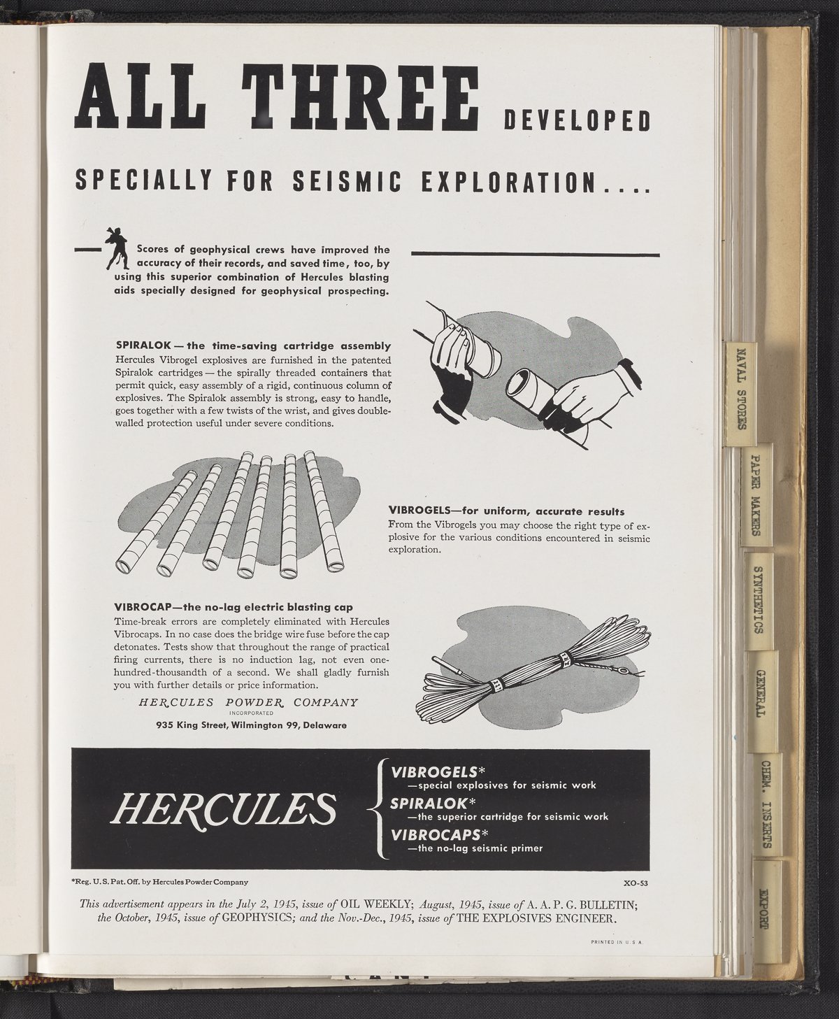Hercules Incorporated. “All Three Developed Specially for Seismic Exploration...” 1945 Hercules Advertisements, 1945. Records of Hercules Incorporated, Volume 1945. Science History Institute. Philadelphia. https://digital.sciencehistory.org/works/707958363.