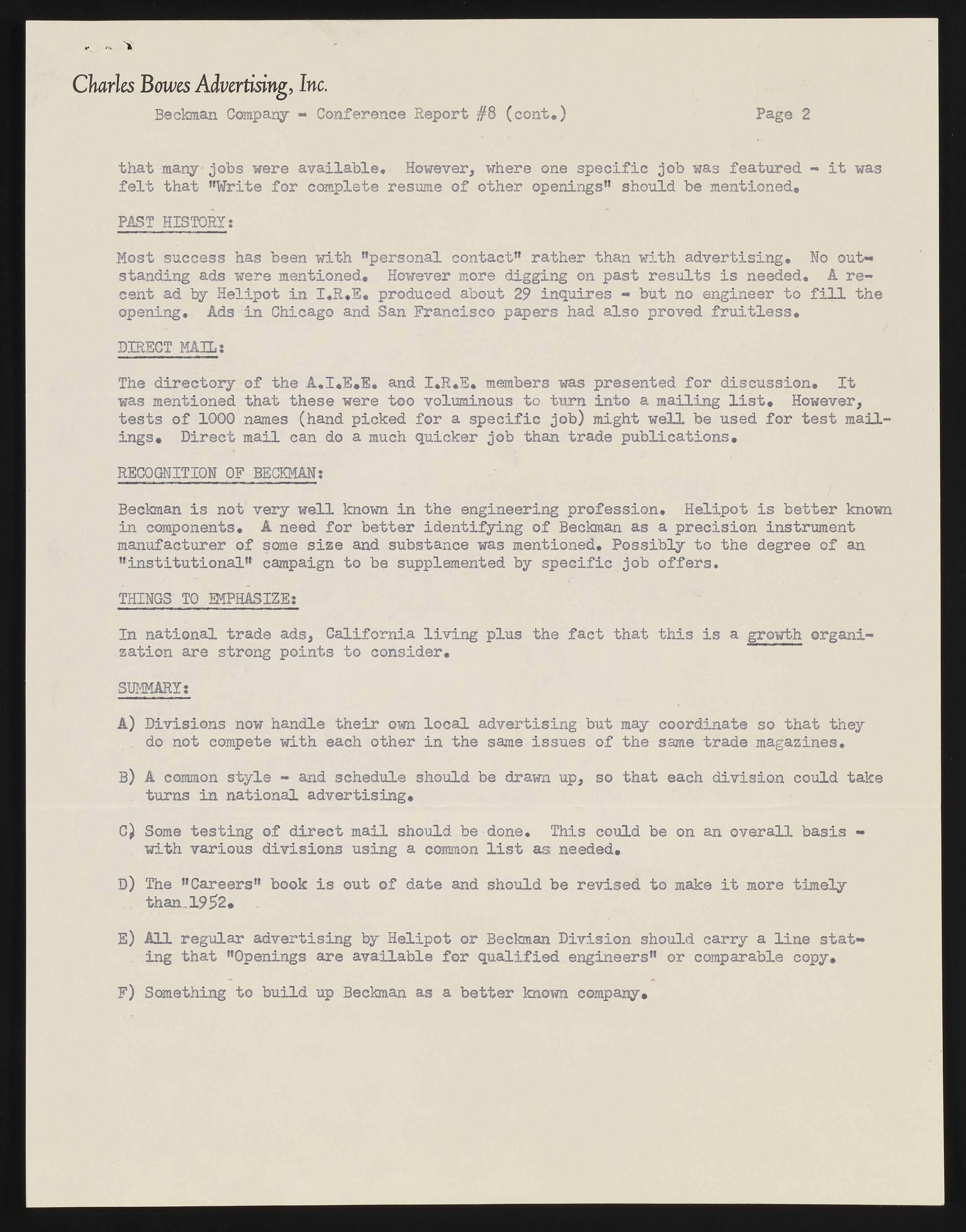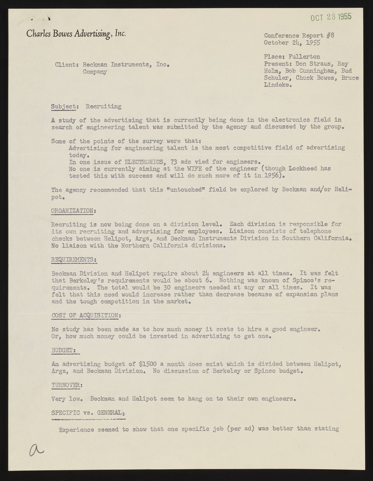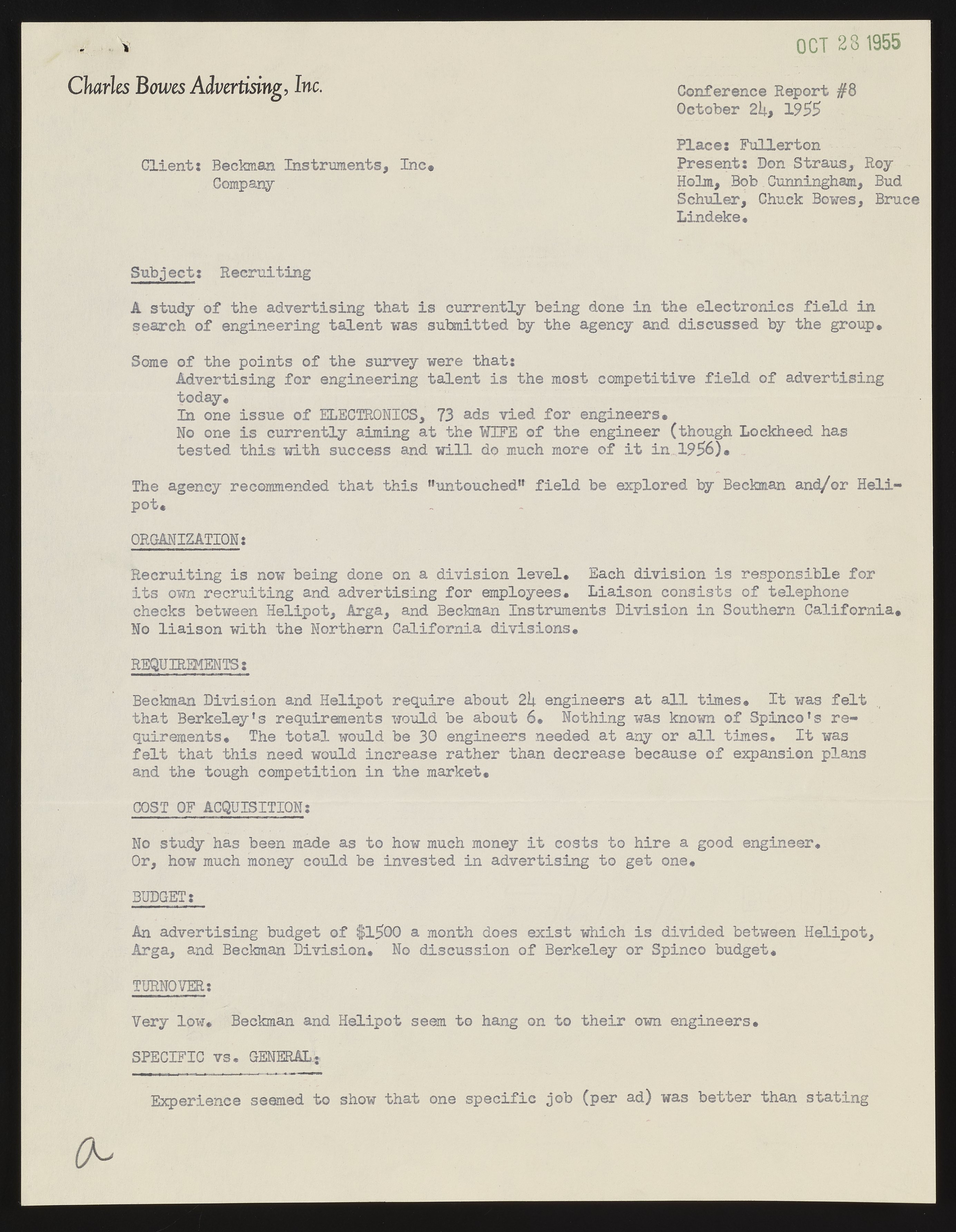 Charles Bowes Advertising. “Charles Bowes Advertising Client Report on Beckman Company,” October 24, 1955. Beckman Historical Collection, Box 10, Folder 8. Science History Institute. Philadelphia. https://digital.sciencehistory.org/works/70795846b.