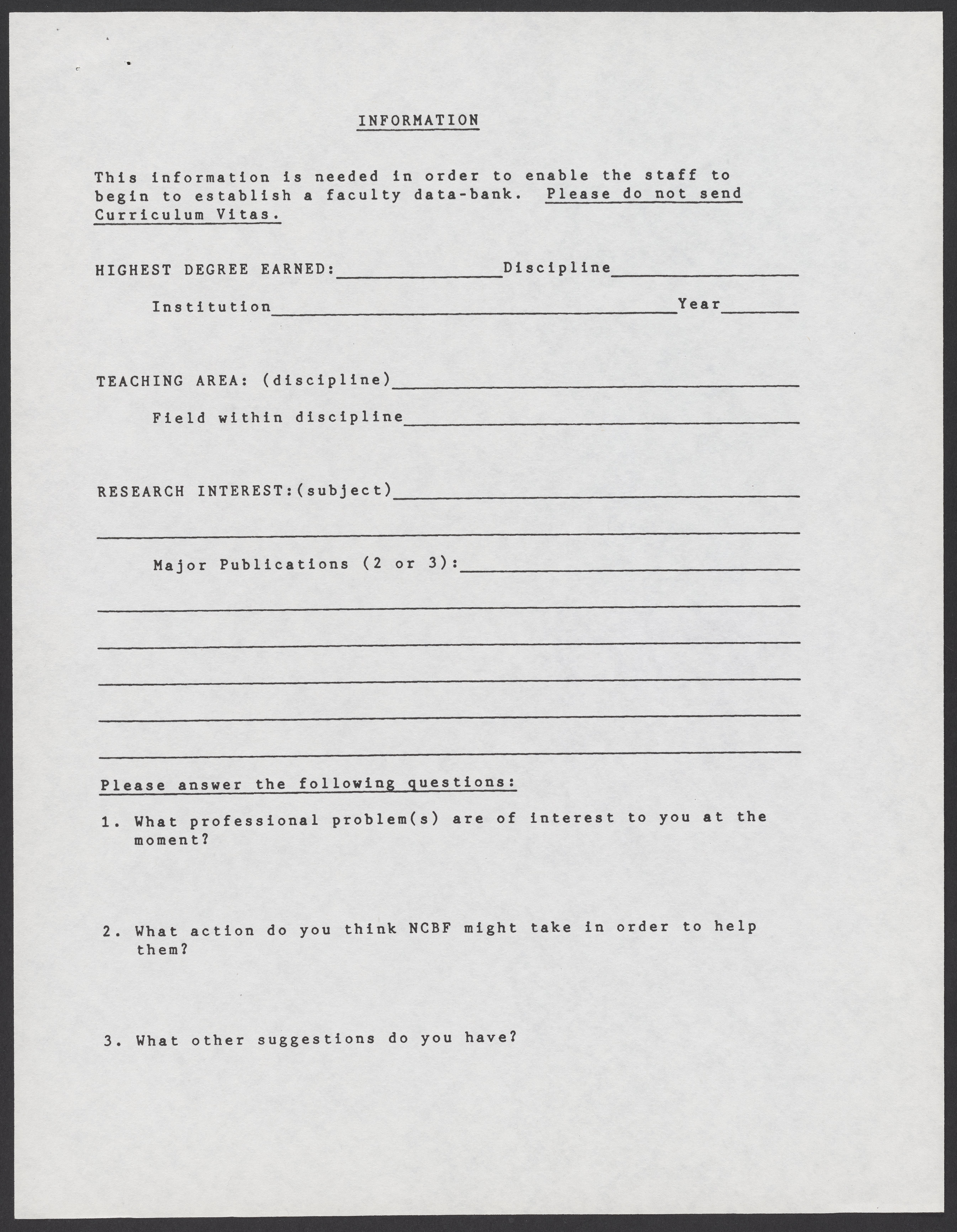 Small JPG1200 x 1550px — 342 KBLarge JPG2880 x 3720px — 1.7 MBFull-sized JPG5363 x 6927px — 5.4 MBOriginal fileTIFF — 5363 x 6927px — 106 MBInformation about the first general meeting of the National Congress of Black Faculty, held October 23-25, 1987, including objectives, themes, schedule, and registration forms.
