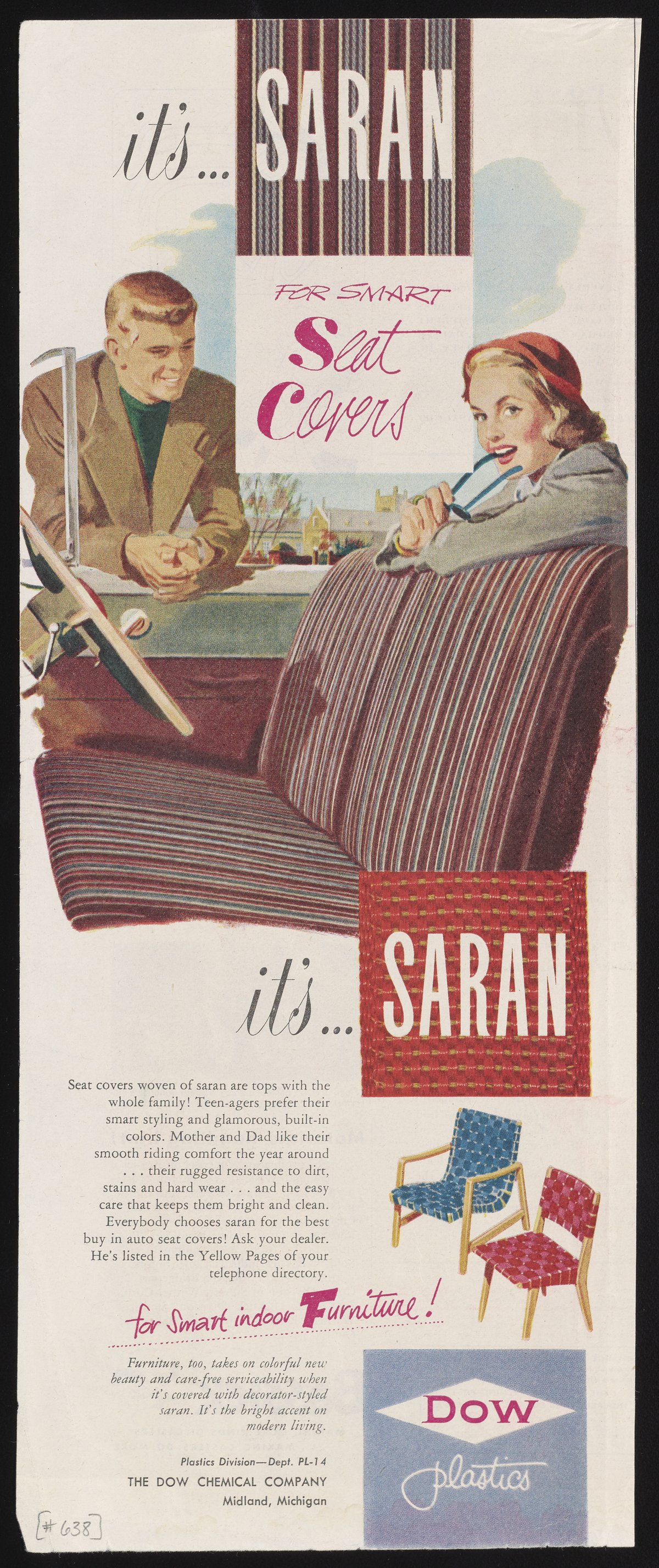Dow Chemical Company. “It'S...SARAN for Smart Seat Covers. It'S...SARAN for Smart Indoor Furniture!,” 1950–1959. Advertisements from the Dow Chemical Historical Collection, Box 9. Science History Institute. Philadelphia. https://digital.sciencehistory.org/works/721lo82.