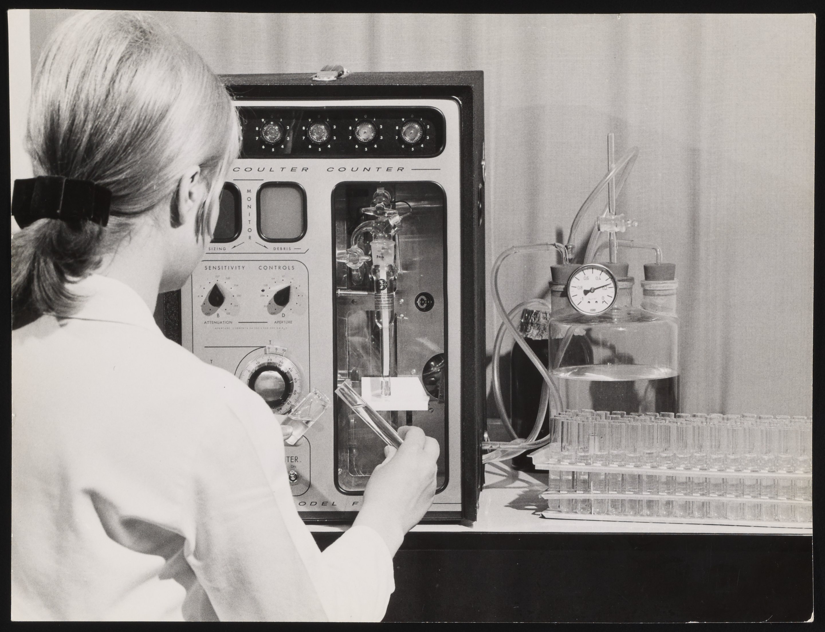 “Woman Using a Model F Coulter Counter Cell Counter,” 1969. Beckman Historical Collection, Box 58, Folder 94. Science History Institute. Philadelphia. https://digital.sciencehistory.org/works/736664585.