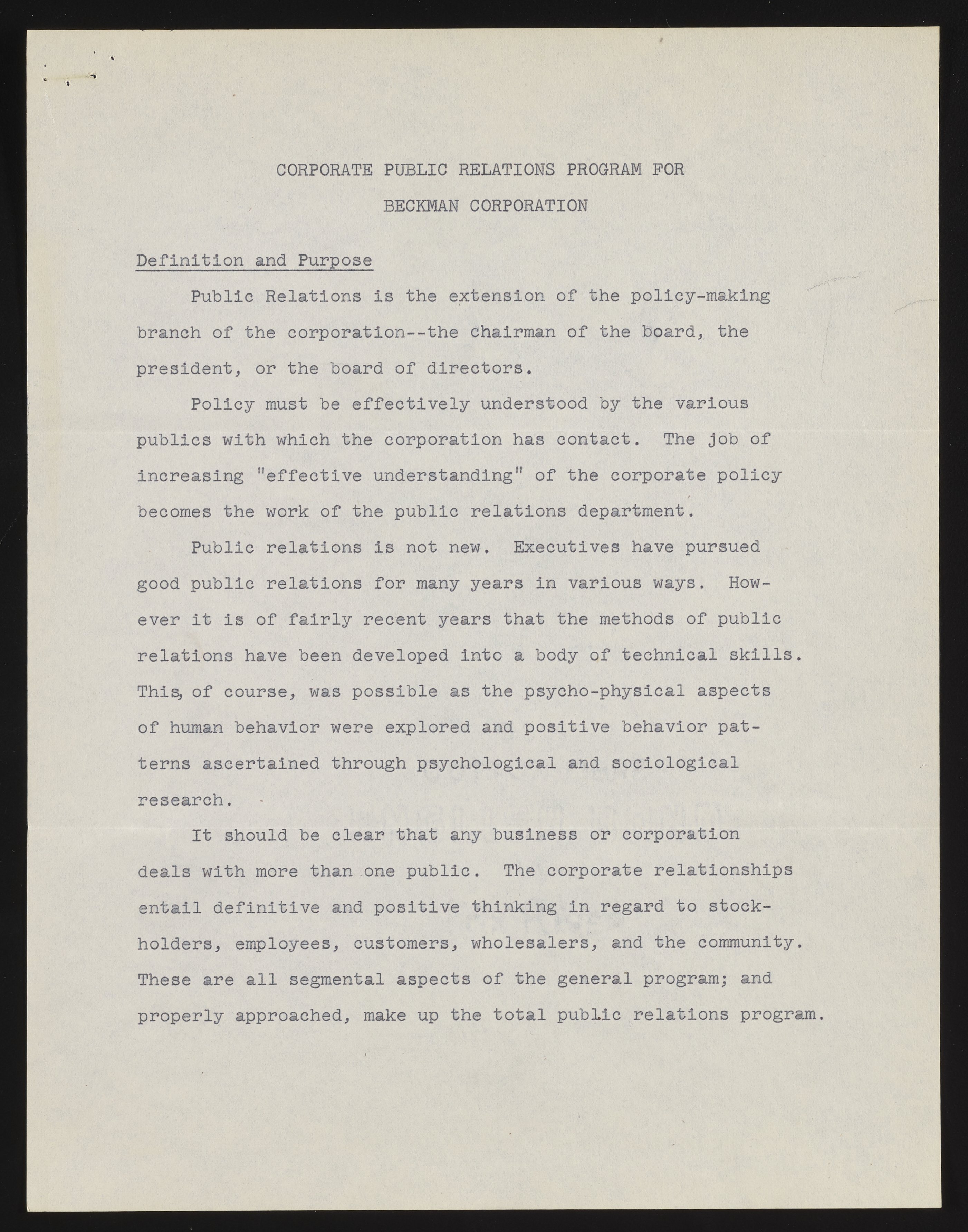 “Corporate Public Relations Program for Beckman Corporation,” June 27, 1955. Beckman Historical Collection, Box 2, Folder 3. Science History Institute. Philadelphia. https://digital.sciencehistory.org/works/736665352.