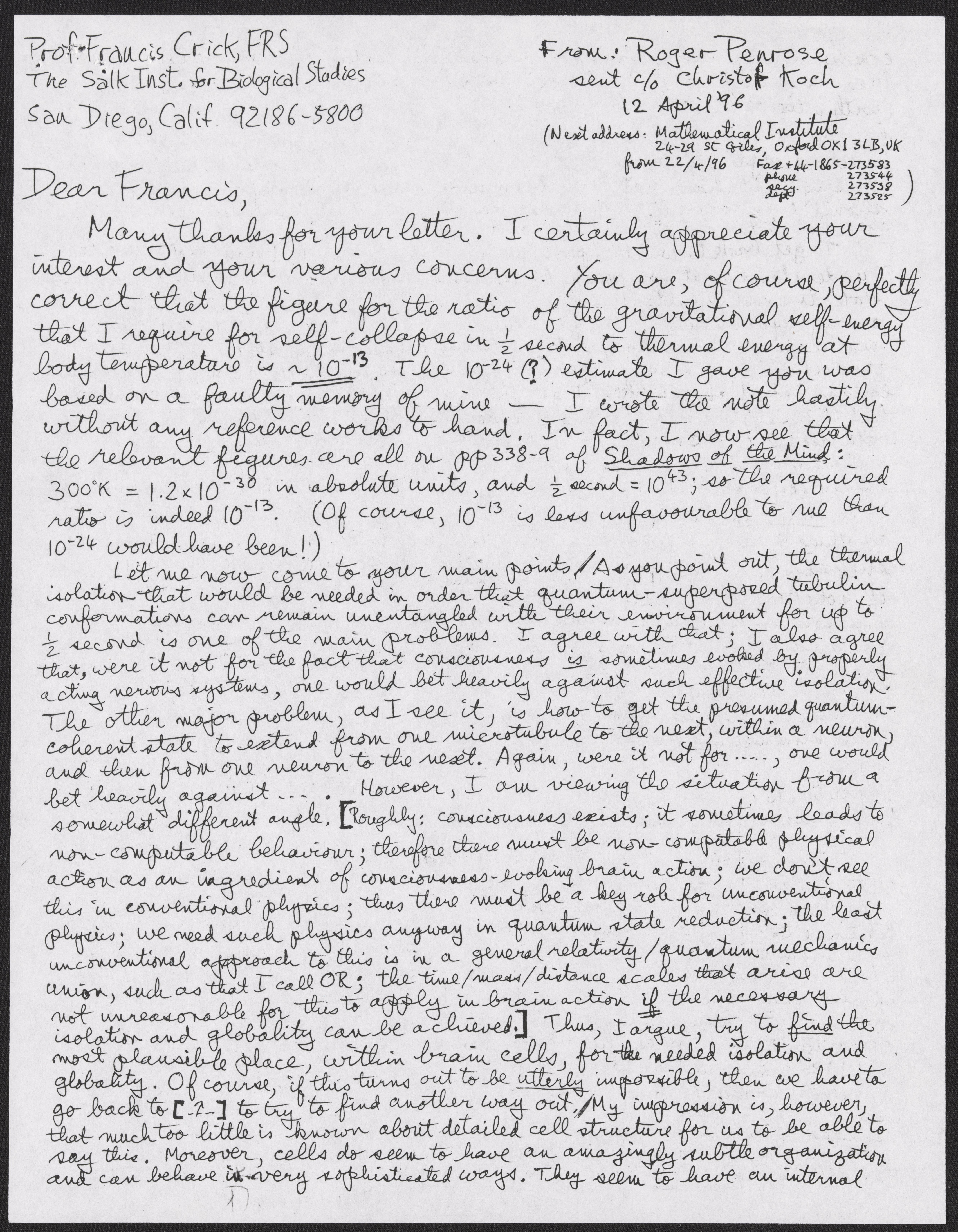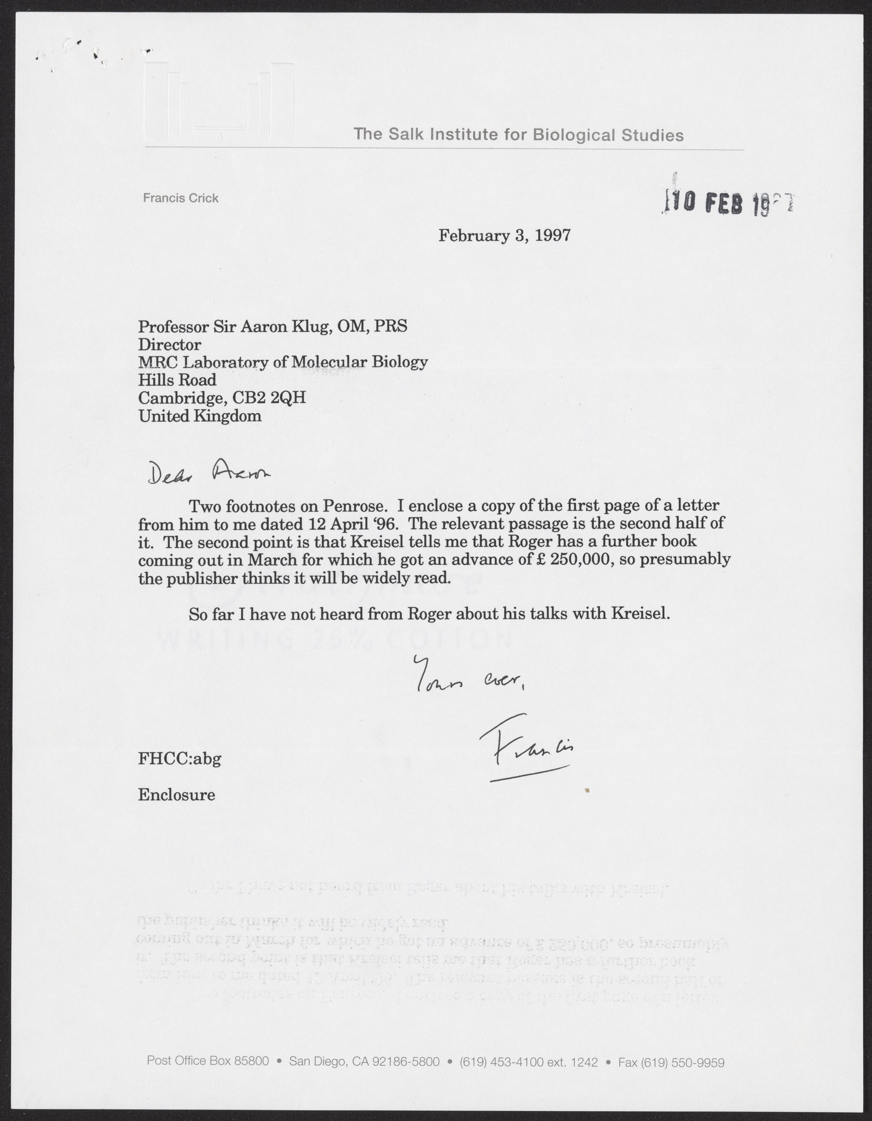Letter from Francis Crick to Aaron Klug, February 3, 1997