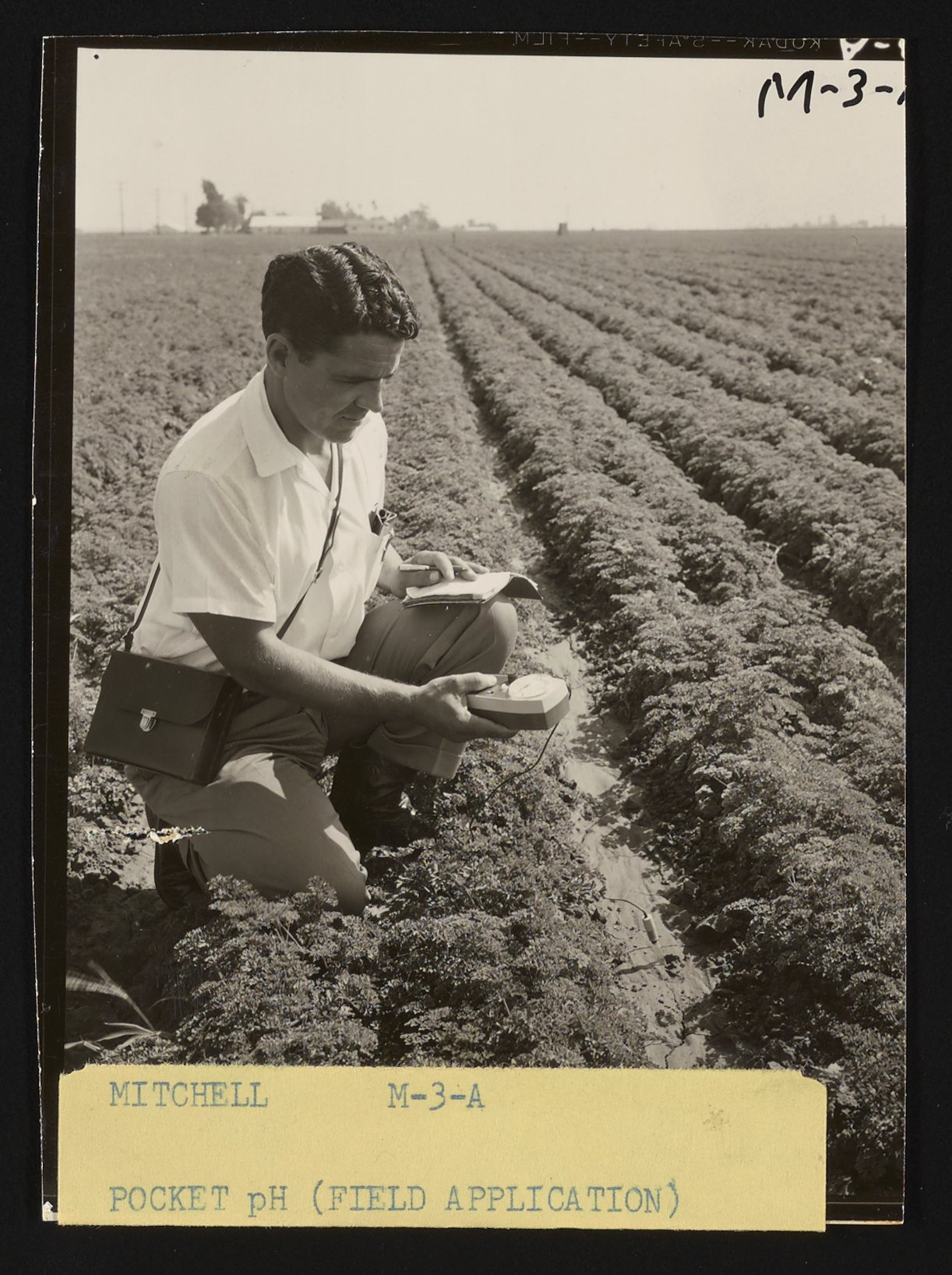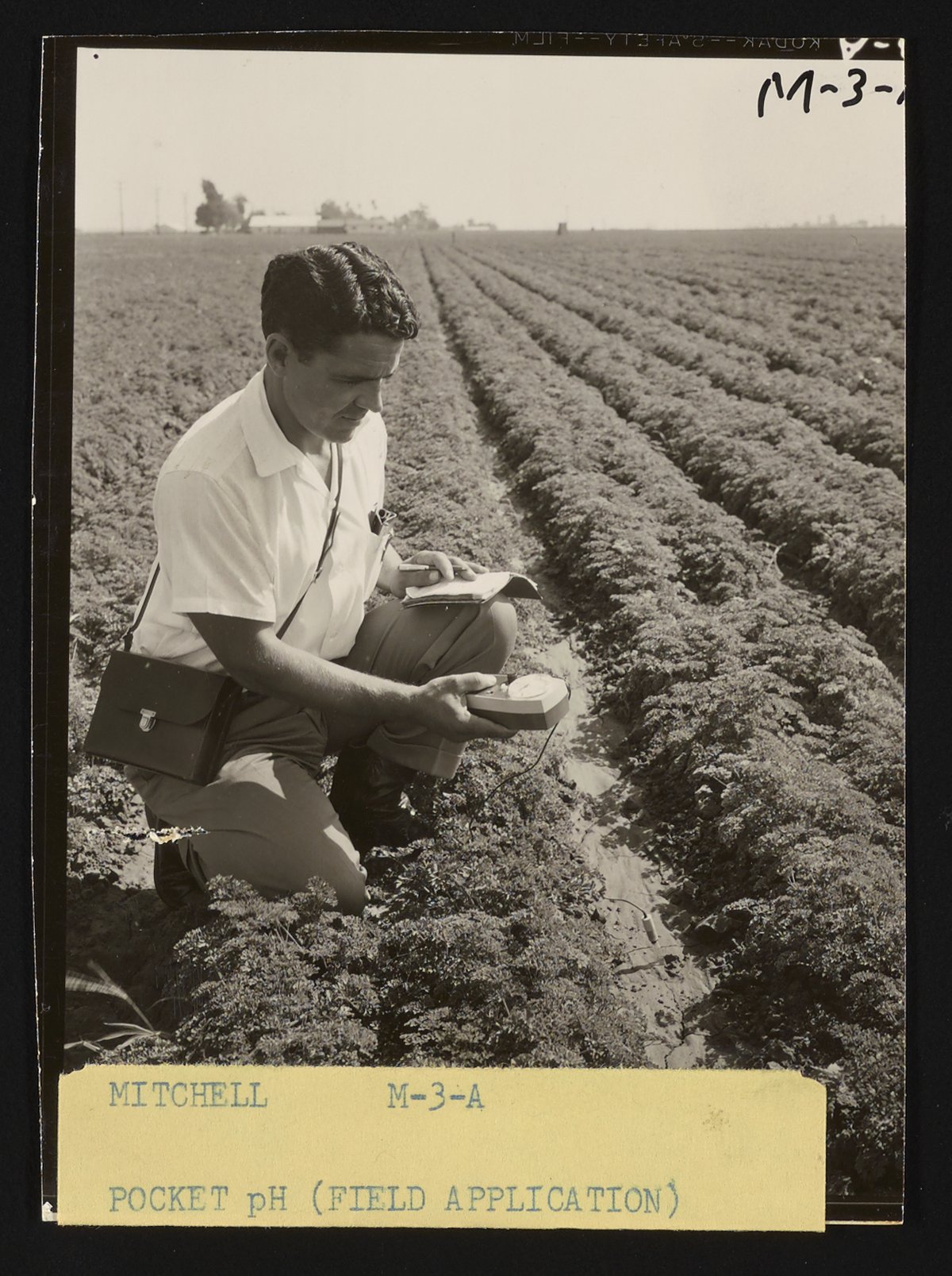 Preston E. Mitchell Commercial Photography. “Man in a Field of Crops Using a Beckman Pocket PH Meter,” circa 1956. Beckman Historical Collection, Box 86. Science History Institute. Philadelphia. https://digital.sciencehistory.org/works/765371328.