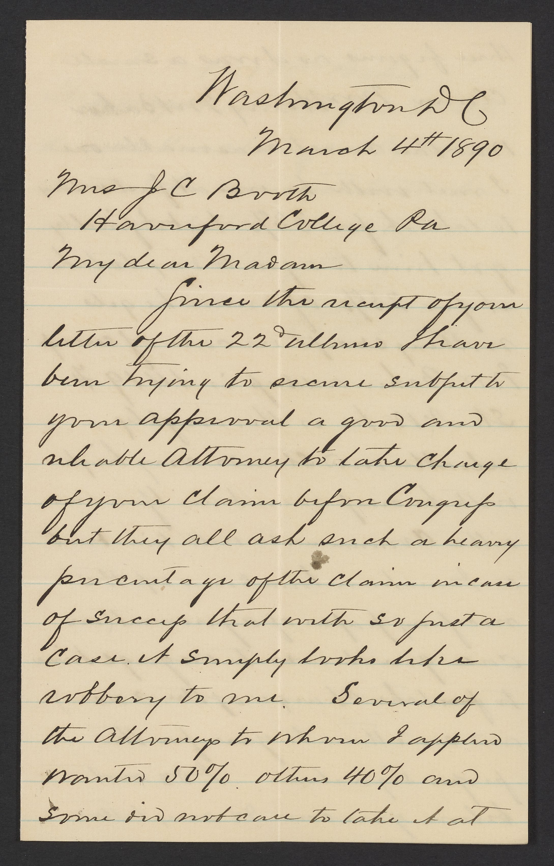Small JPG1200 x 1873px — 342 KBFull-sized JPG2178 x 3400px — 998 KBOriginal fileTIFF — 2178 x 3400px — 21.2 MBLetter from Robert E. Preston (1836-1911), of the United States Mint Bureau, to Margaret M. Booth née Cardeza to inform Mrs. Booth that he has been looking into securing the services of an attorney for her, but is unhappy about the large percentages of any award that they will claim as their fee. He recommends Mr. Henry M. Baker.