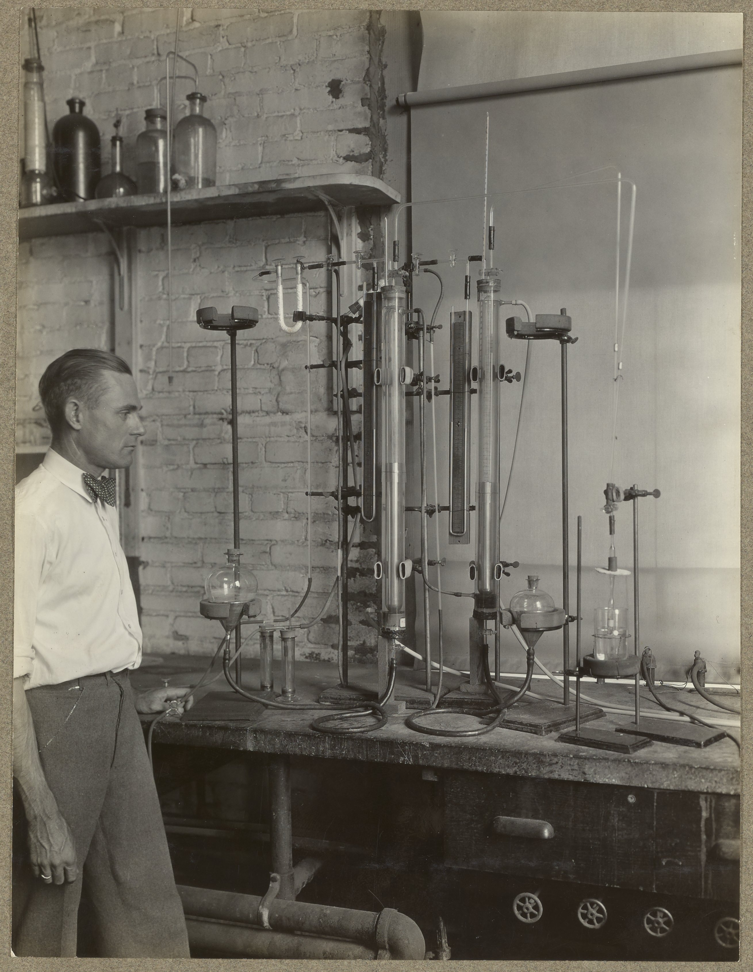 “C.A. Black with Apparatus for Filling Tubes,” July 26, 1927. Travis P. Hignett Collection of Fixed Nitrogen Research Laboratory Photographs, Box 1. Science History Institute. Philadelphia. https://digital.sciencehistory.org/works/79407x23c.
